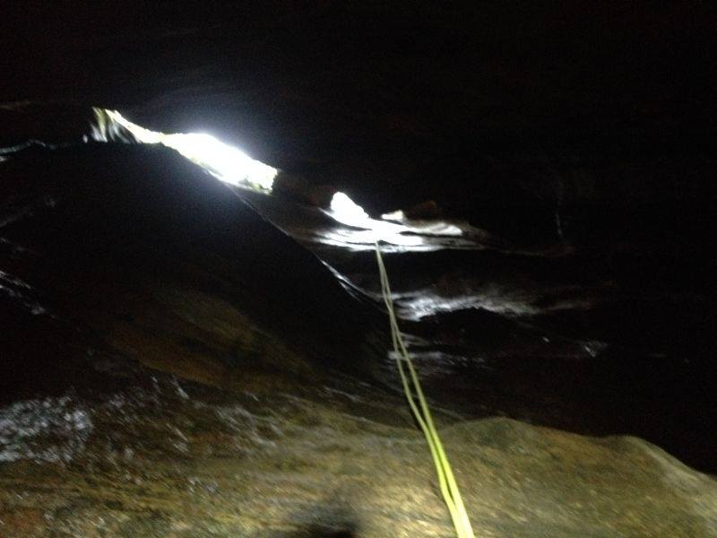 Meggs wasted no time getting the rope out as we geared up. Tossing the ends into the crevice there was a definite splash. “You said this was dry!” “I said normally dryish”