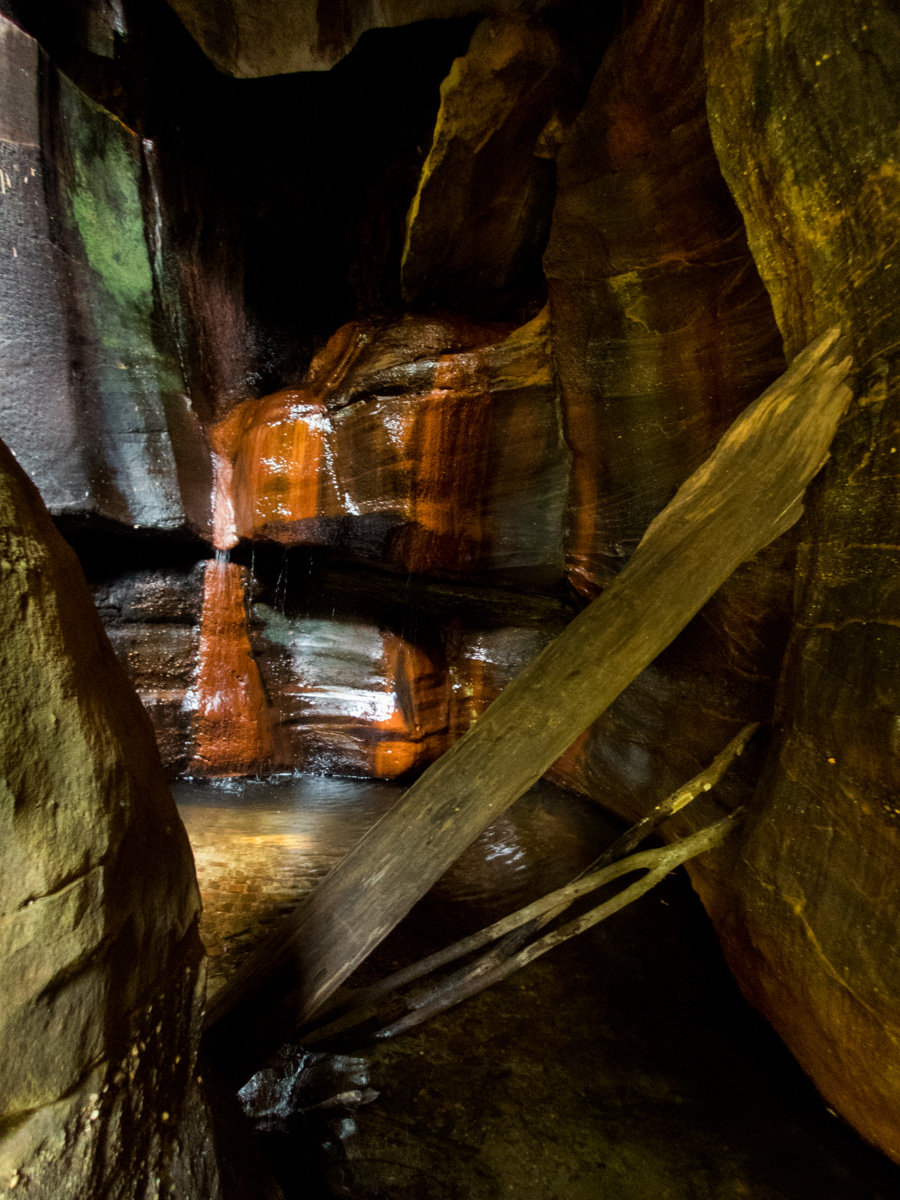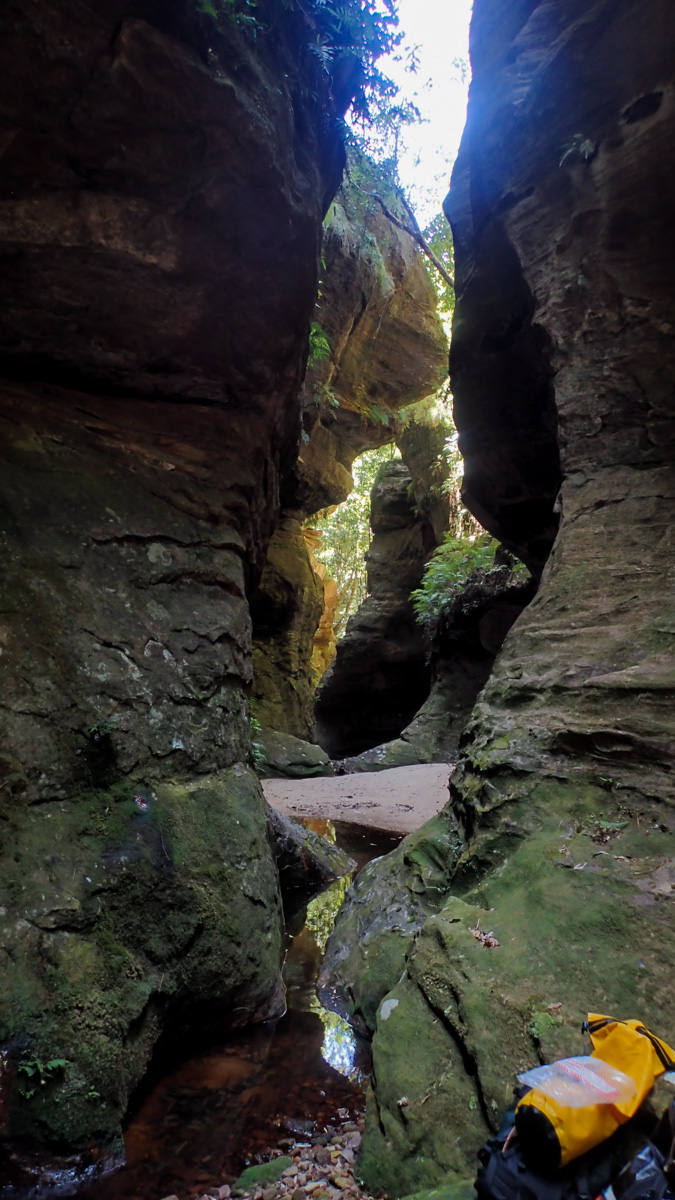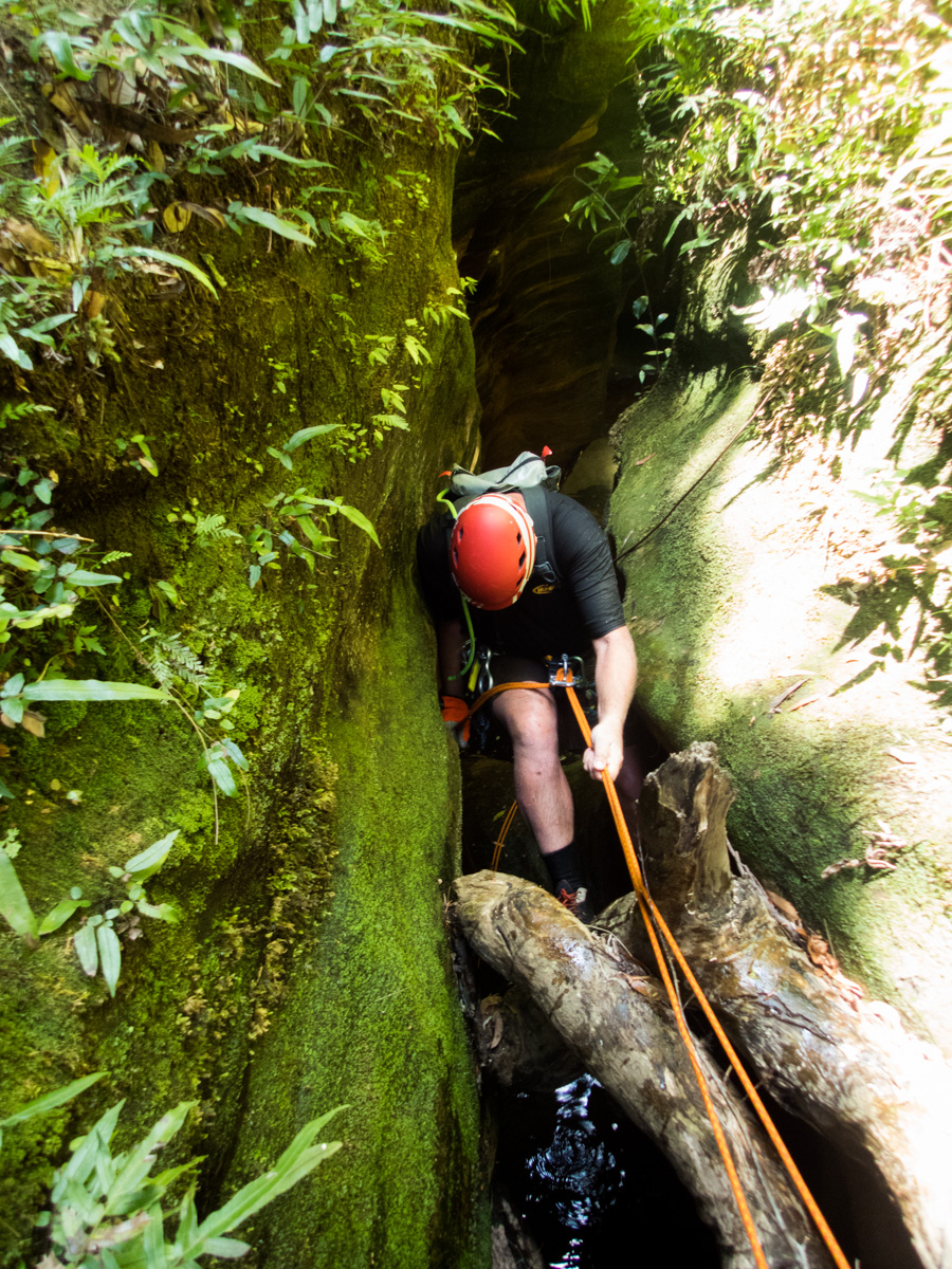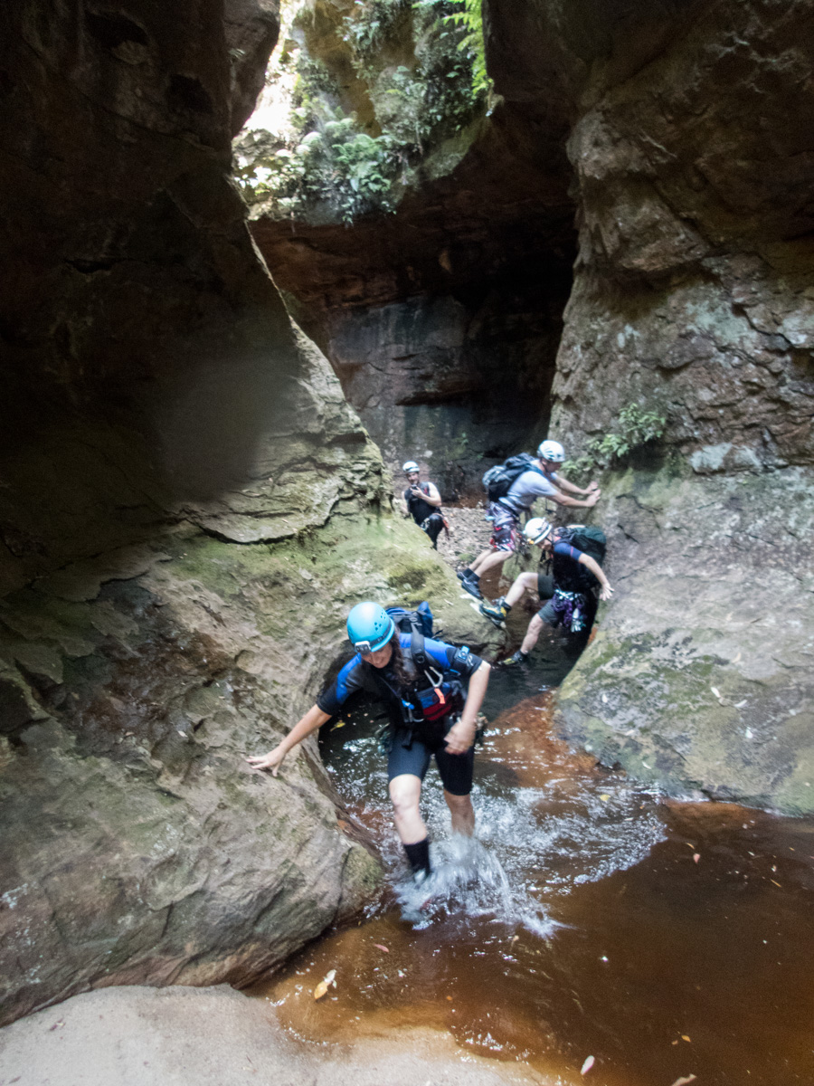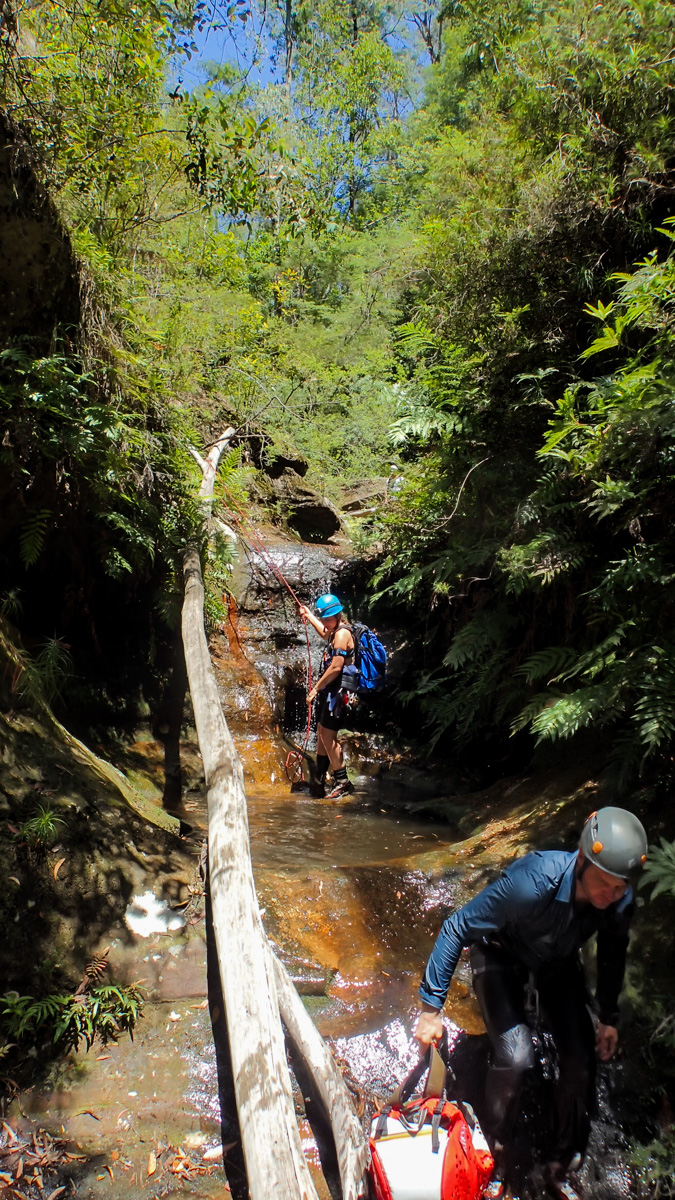 We follow a steep ridge littered with loose scree to the base of the mighty Wolgan cliffline. Breaching the cliff was surprisingly easy. Our original plan had been to scramble out onto the tops, across a ridge to descend into the top of the canyon. With the sun blazing overhead we opted to stay in a shady gully and found this gave us a relatively easy way onto the halfway ledge that runs above the canyon all the way up to the start.