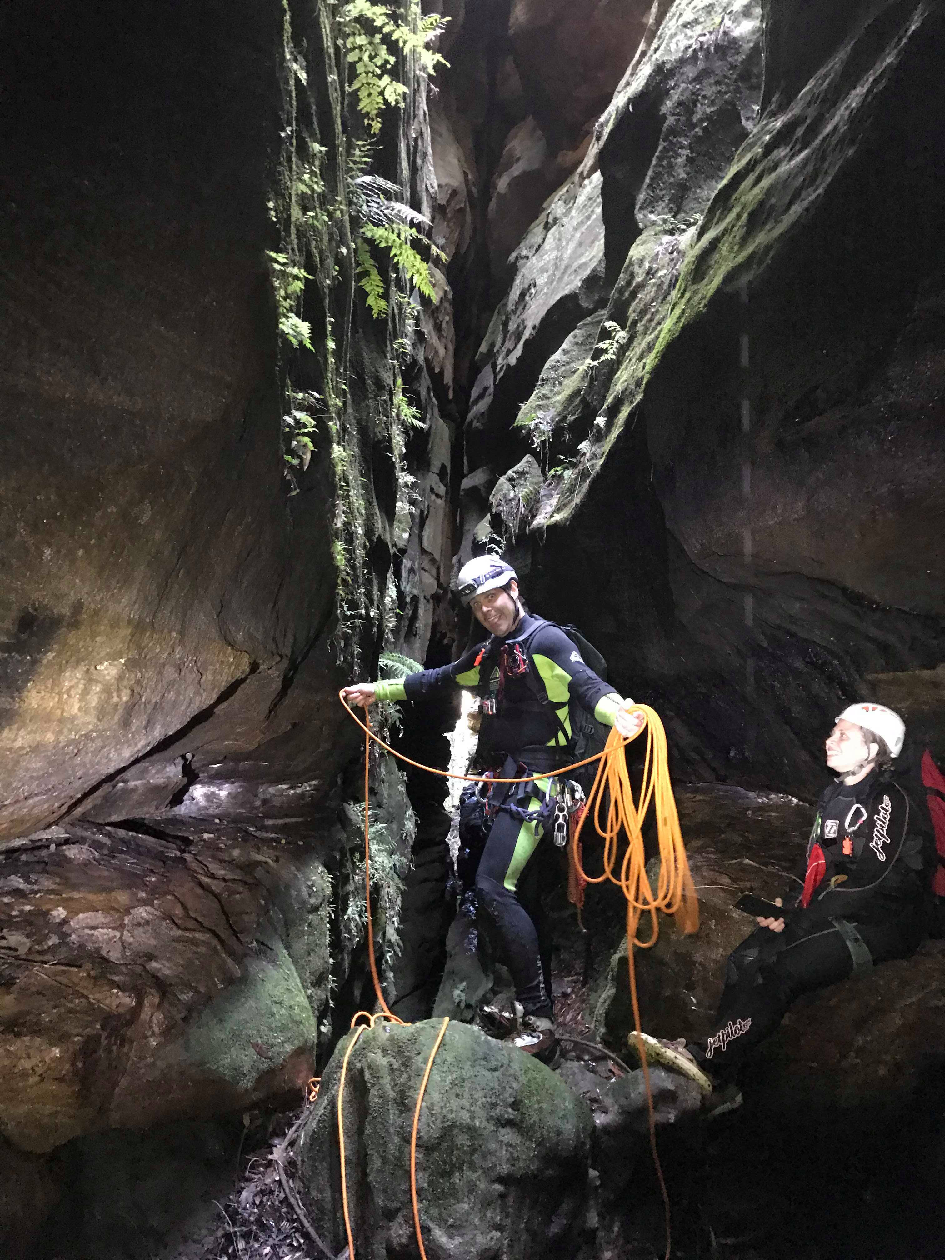 and then it was an easy but longish walk up the ridge and back down to collect the camp gear. We opted to exchange it for the canyon gear, hanging wetsuits, ropes and harness in a tree to dry. this saved us carting it all into the camp cave only to carry it back out tomorrow.