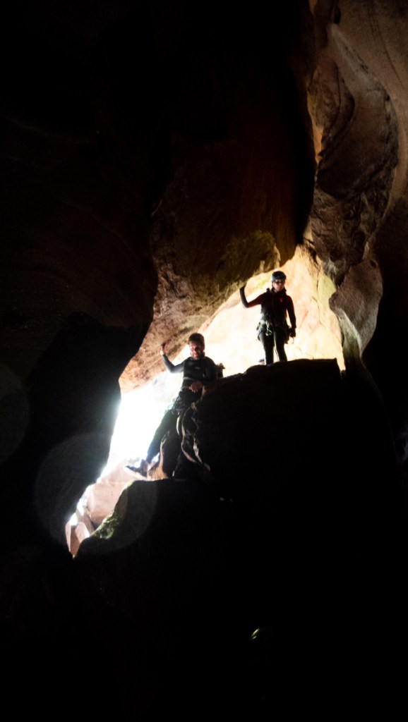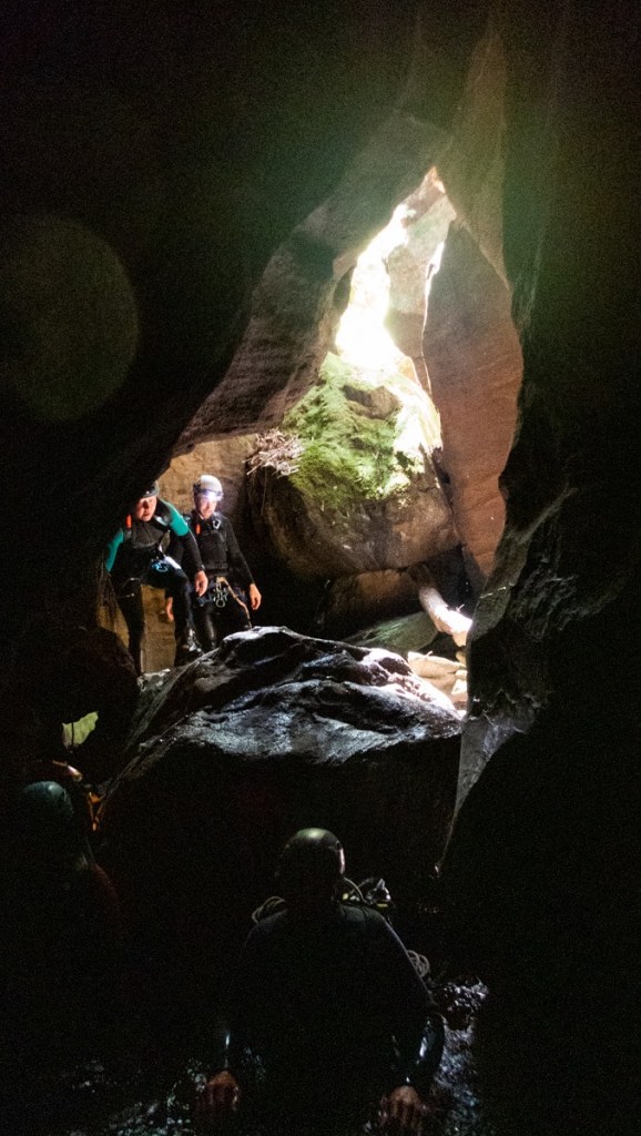 We briefly check out a rumoured short cut exit but decide the climb is too dicey today so it’s into the ‘Gambe for a float down to the usual exit.