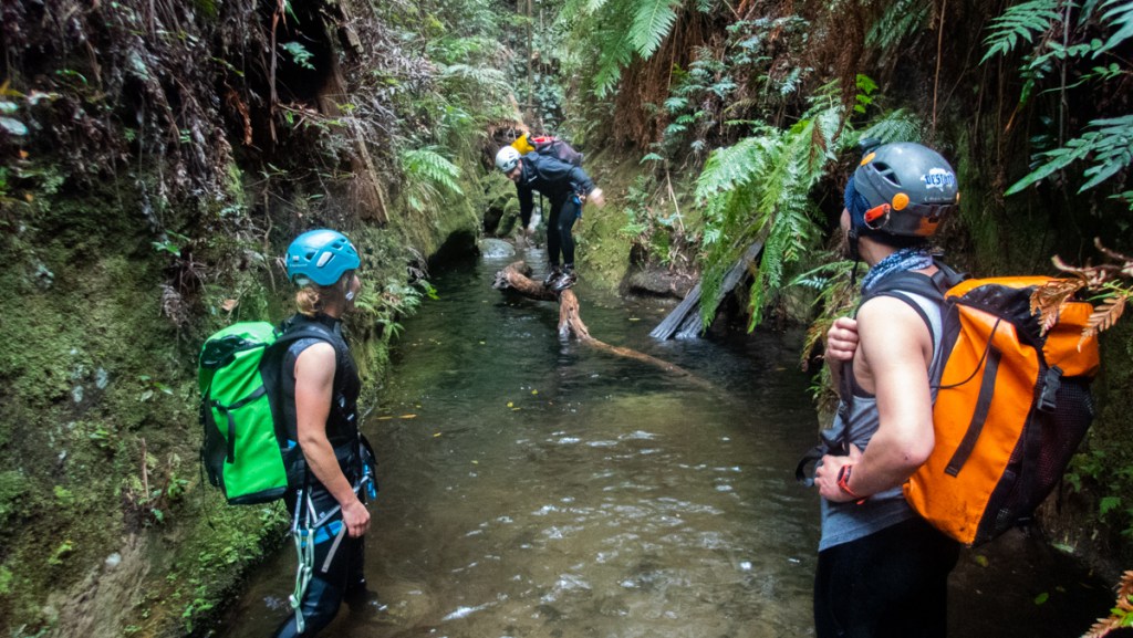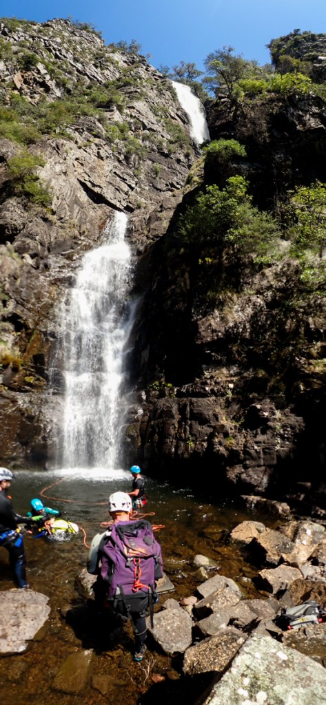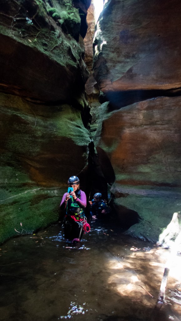The shade of the overhang below the first abseil proves an enticing place to have lunch so more lazing about before we slip down the creek. I scramble into the start of the canyon and try to entice the others down with my best Pennywise impersonation, Do you want a balloon too, Georgie? but they go over the top to the next climb down.
