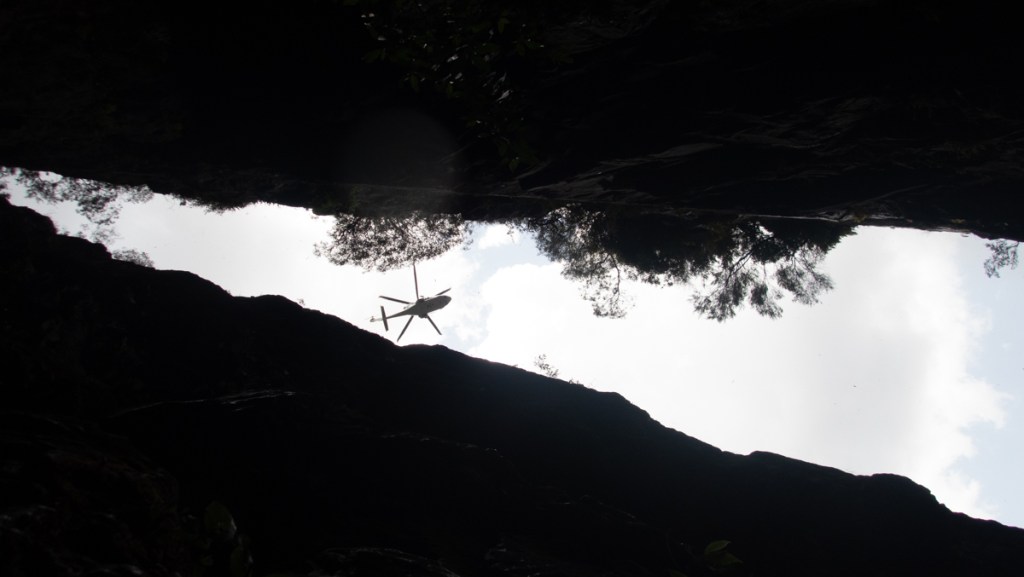 It was about then the chopper arrived, I was blown away about how quick it had responded. But to be honest I have a poor concept of time anyway so I have no idea how long it had been. I’d been told about the down draft by friends in the rescue crew and got Matt and Ethan to hug the walls in case debris came tumbling in. To keep a 9t machine in the air requires 9t of air to be pushed down. It’s bloody awesome.