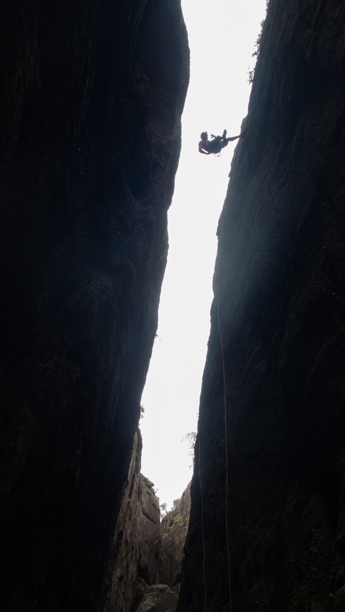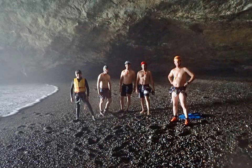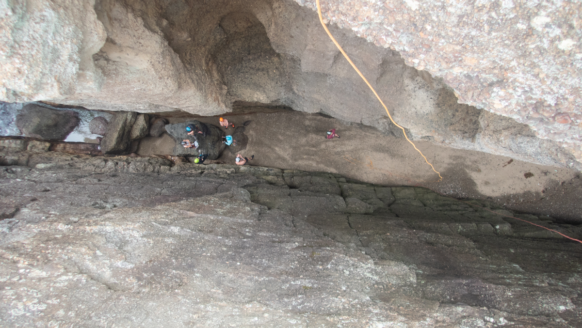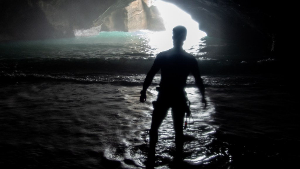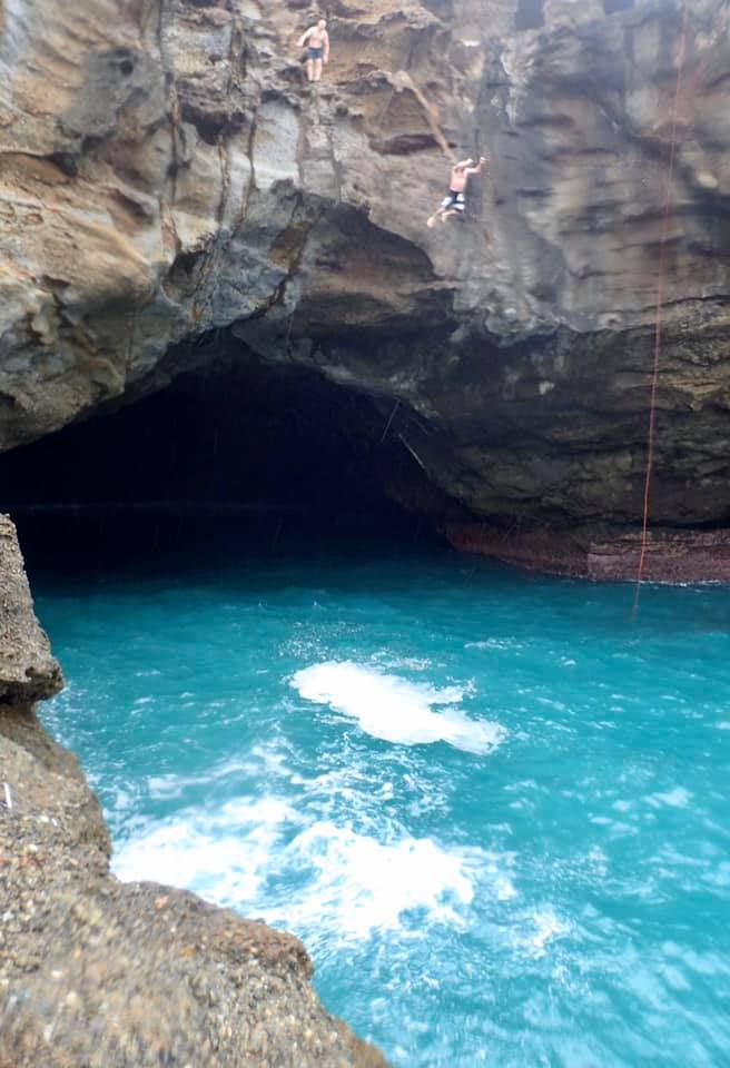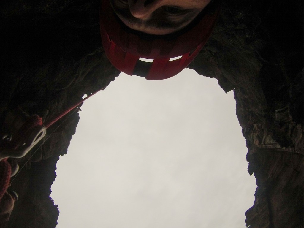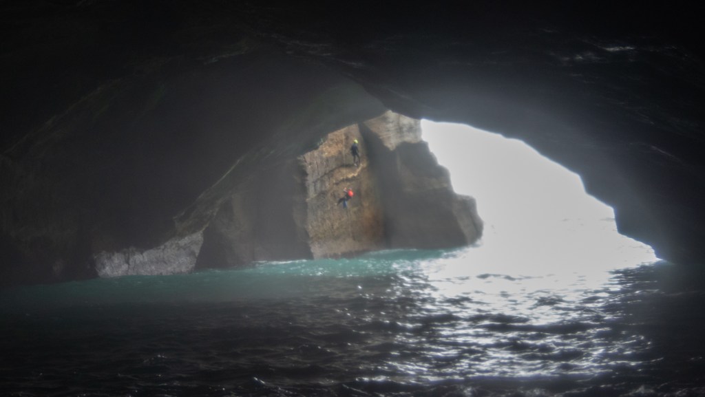 Dropping off the end of the rope we swim into the cave and wait for the others
