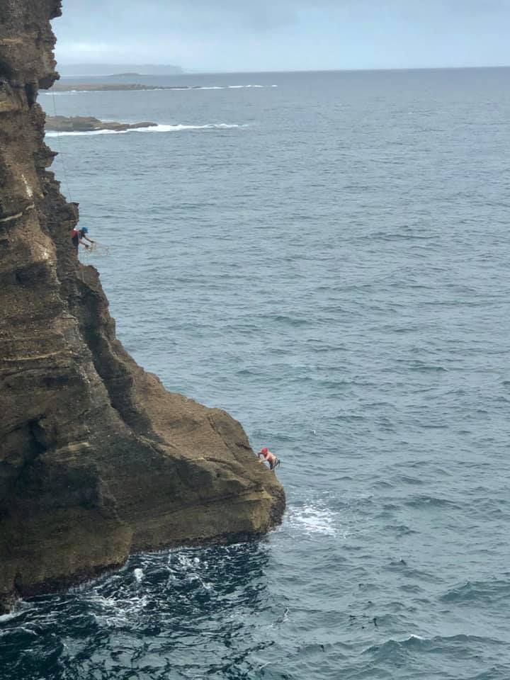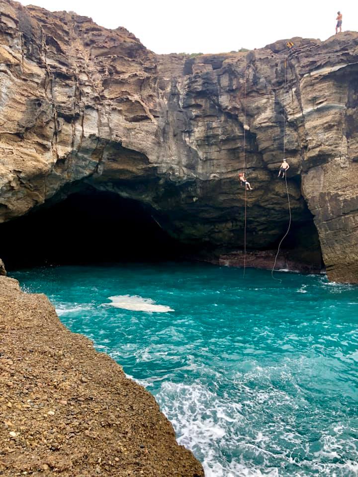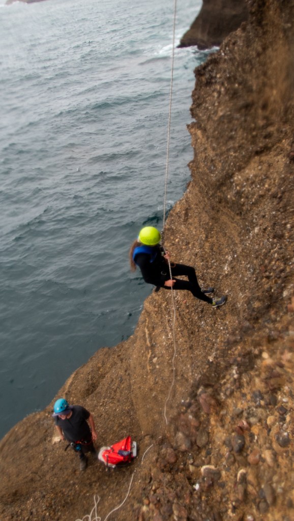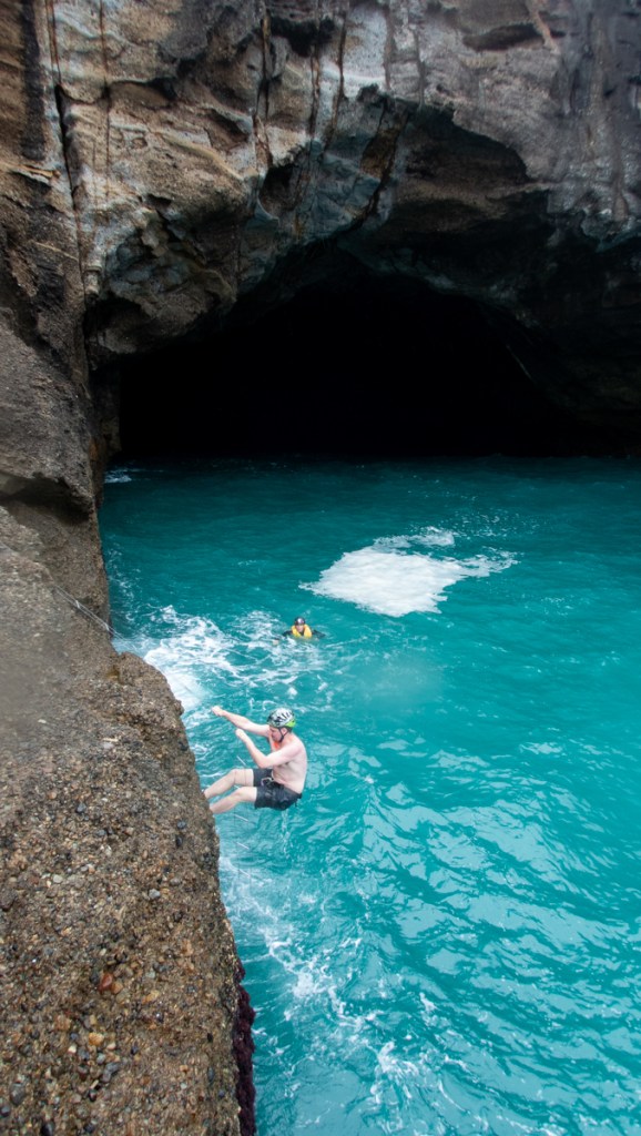 Caution: You need low tide and a swell of under 2 feet to run this trip the way we did it. Also the rock is sharp as a finely honed cutty thing so rope protectors and good start technique are a must.