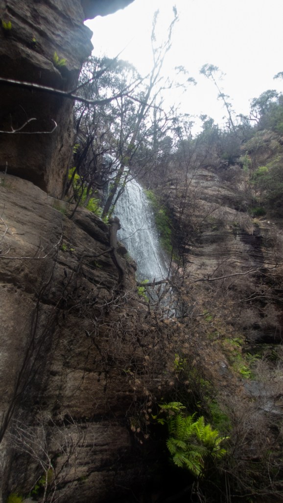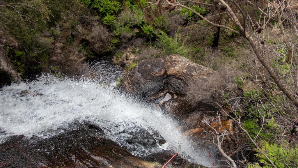 Halfway down it tumbled over a 10m drop… I hadn’t brought ropes. We back track and slip over the ridge, where we catch our first glimps of the falls, and peer down into the next gully