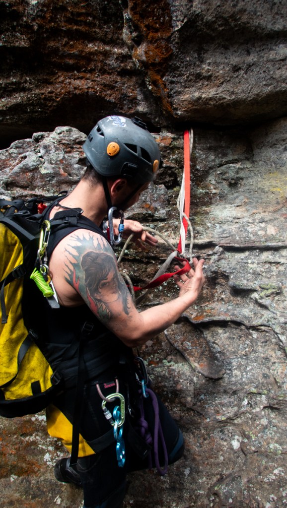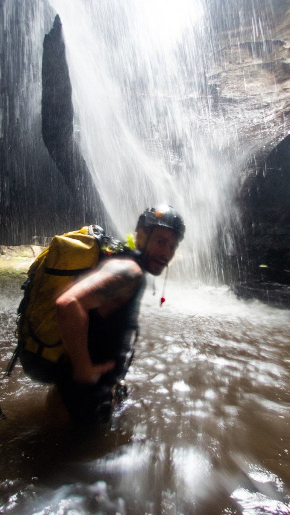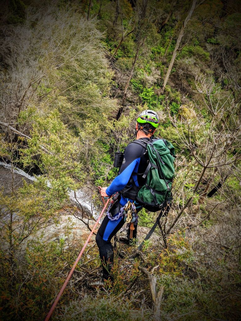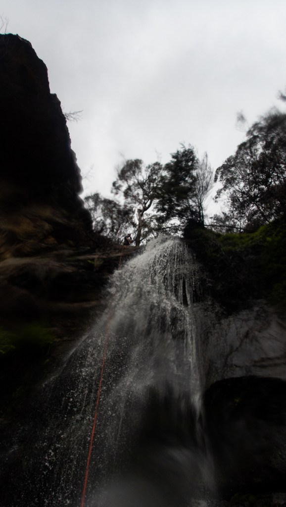 I bridge across a small slot then drop into the full brunt of the fall for the final 12m. It’s a fun abseil.