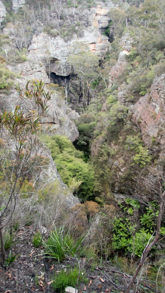 We hit the cliff line above the main creek but we are slightly downstream of the falls. A side gully forms a little canyonette and looked offer a way down.