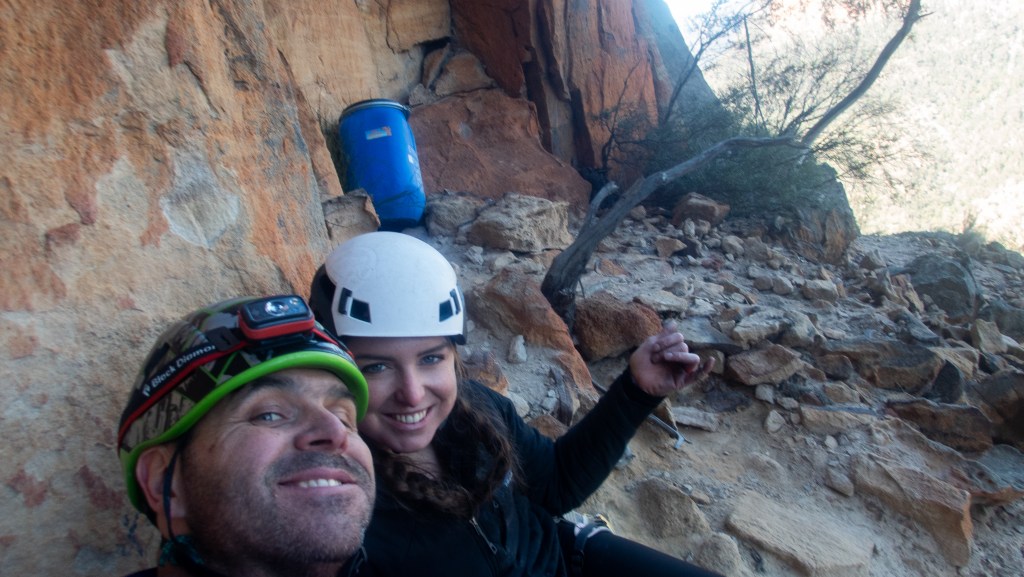 Me and Madie at the lunch ledge. The bucket behind us is full of emergency gear, these climbs have a rep for catching people out and benighting them
