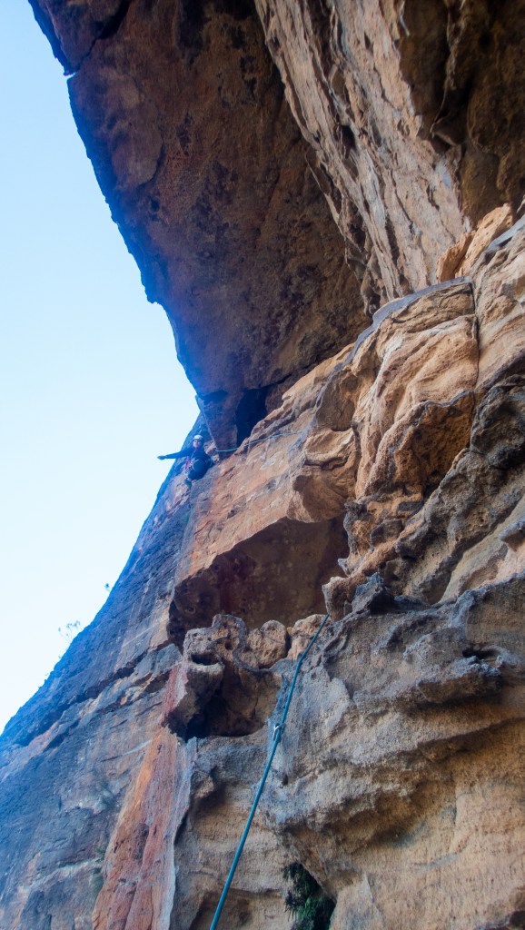 The second last pitch was a glorious vertical wall. Once again it was right at the upper end of my skill level but more to my style than the lower pitches at that grade. I was shot, muscle fatigue had well and truly set in. I’d struggle up 2 or 3m clip my safety to the bolt and hang, resting for what seemed an eternity then I’d go again. But I loved every minute of it.