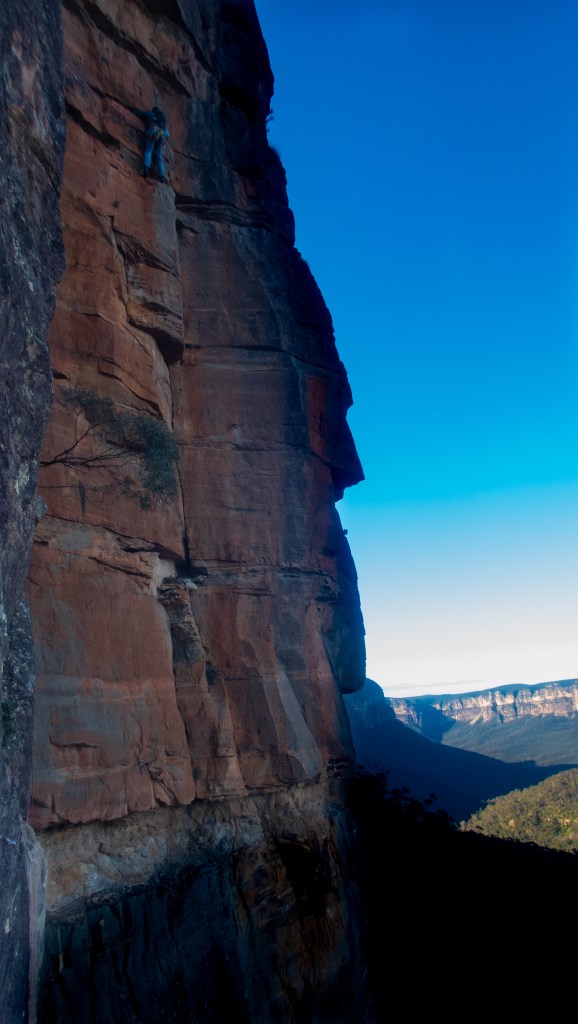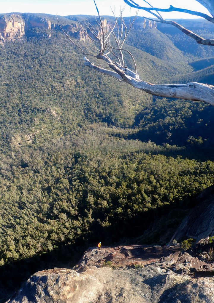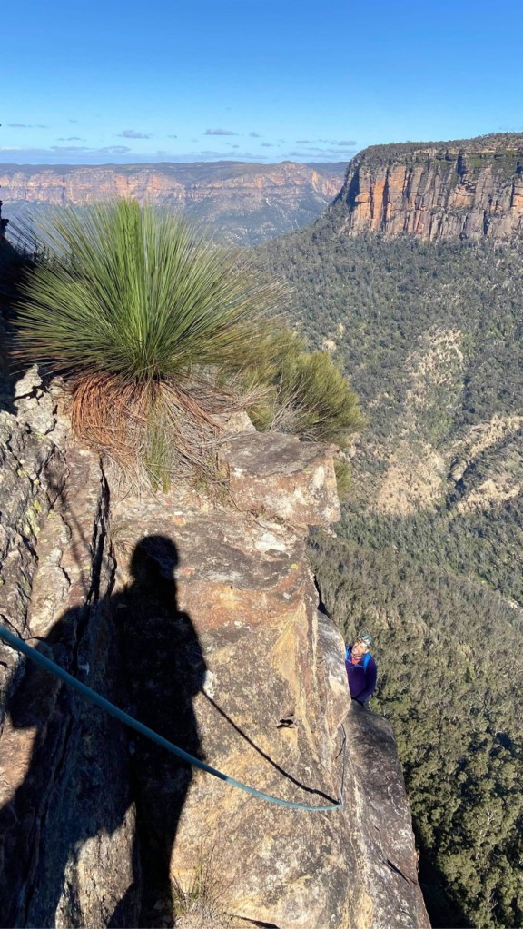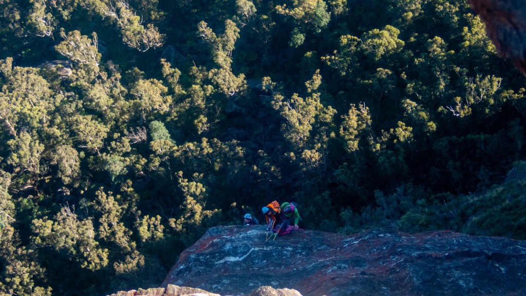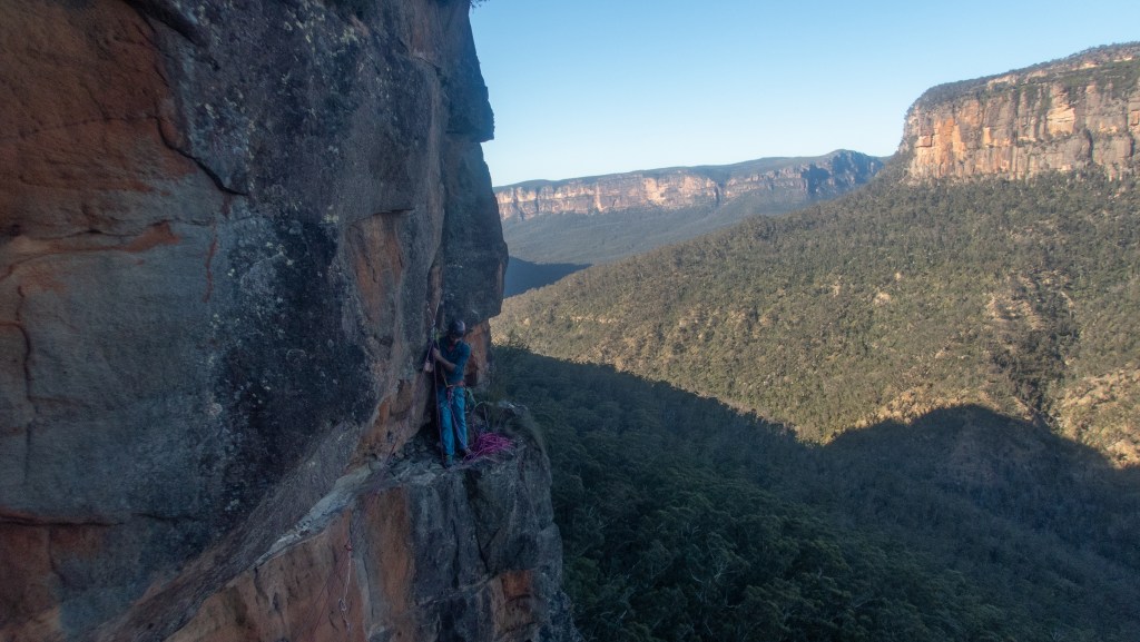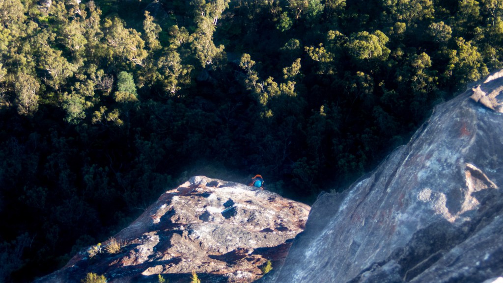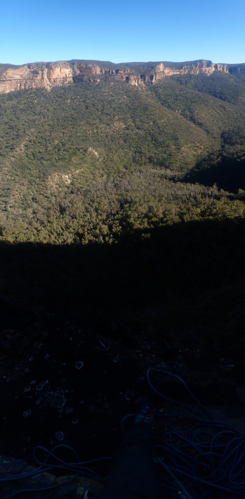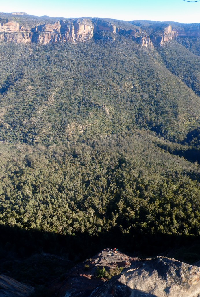 Looking down at Felix at the top of the second last pitch of RRR with the mighty Grose valley views