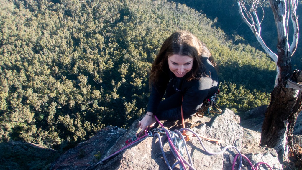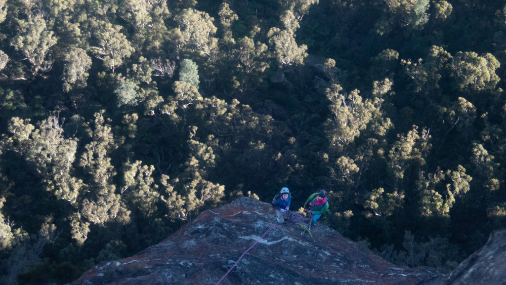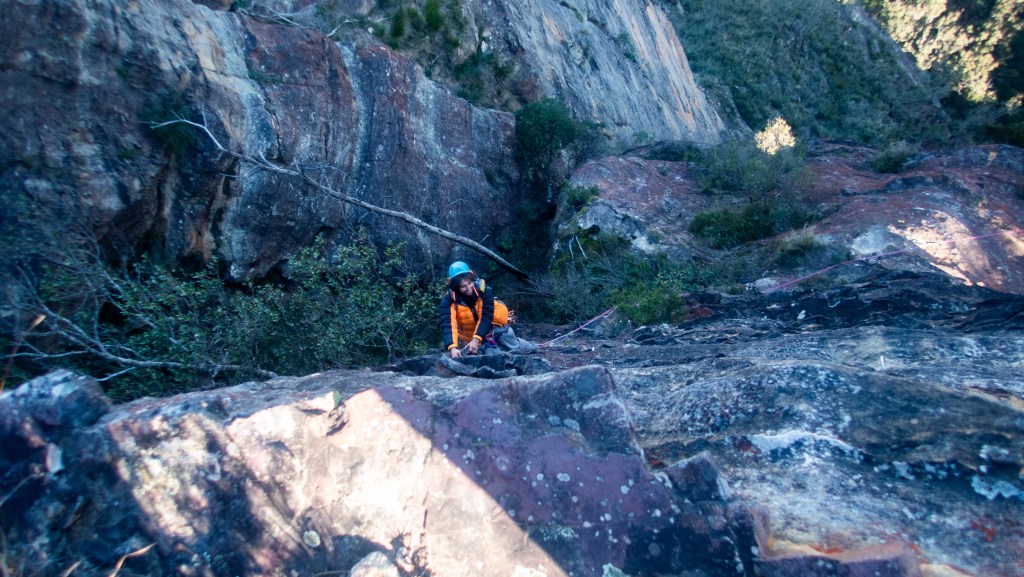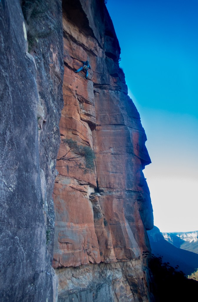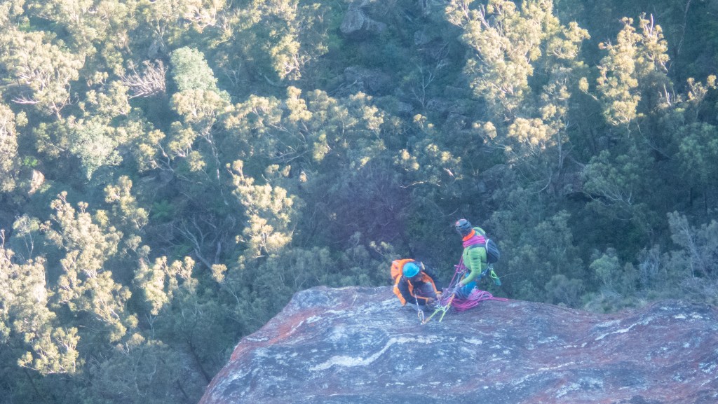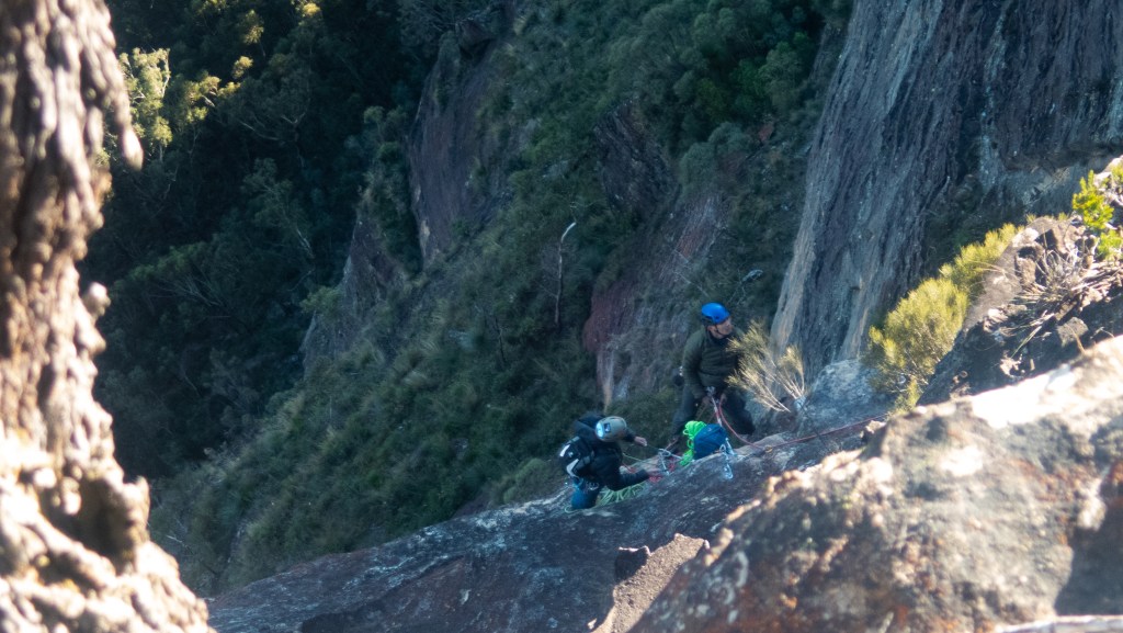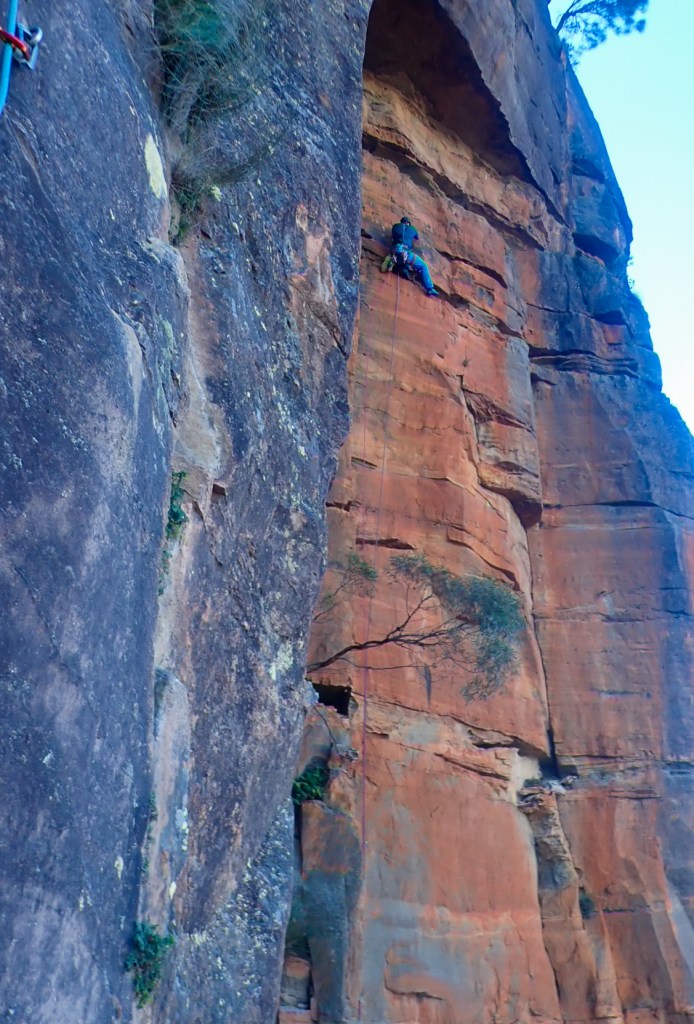 Looking down at Felix at the top of the second last pitch of RRR with the mighty Grose valley views