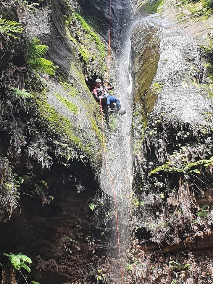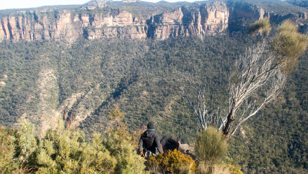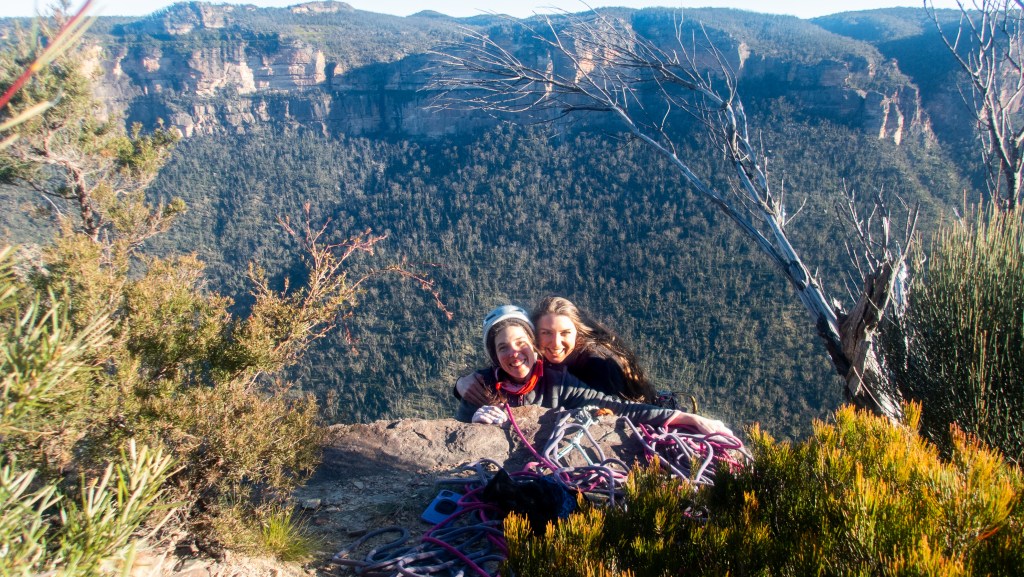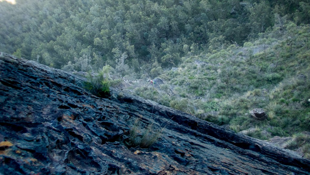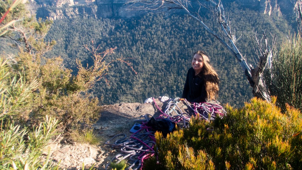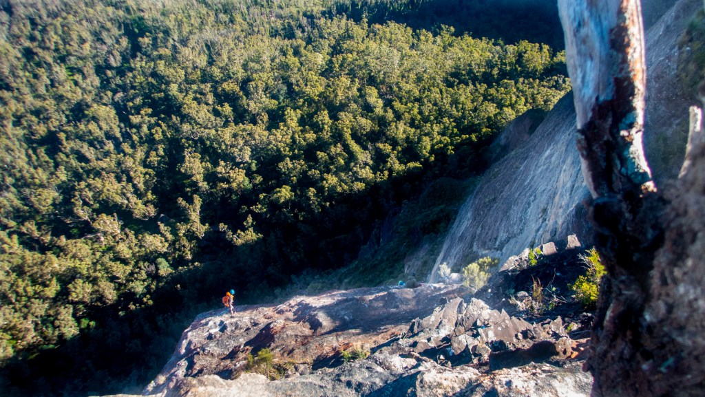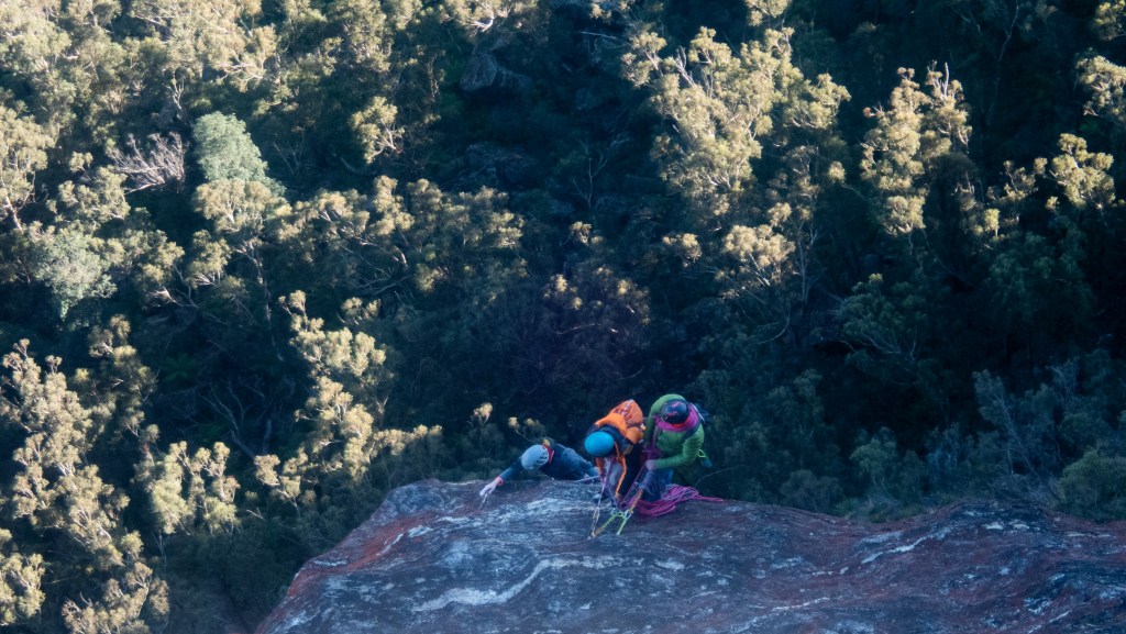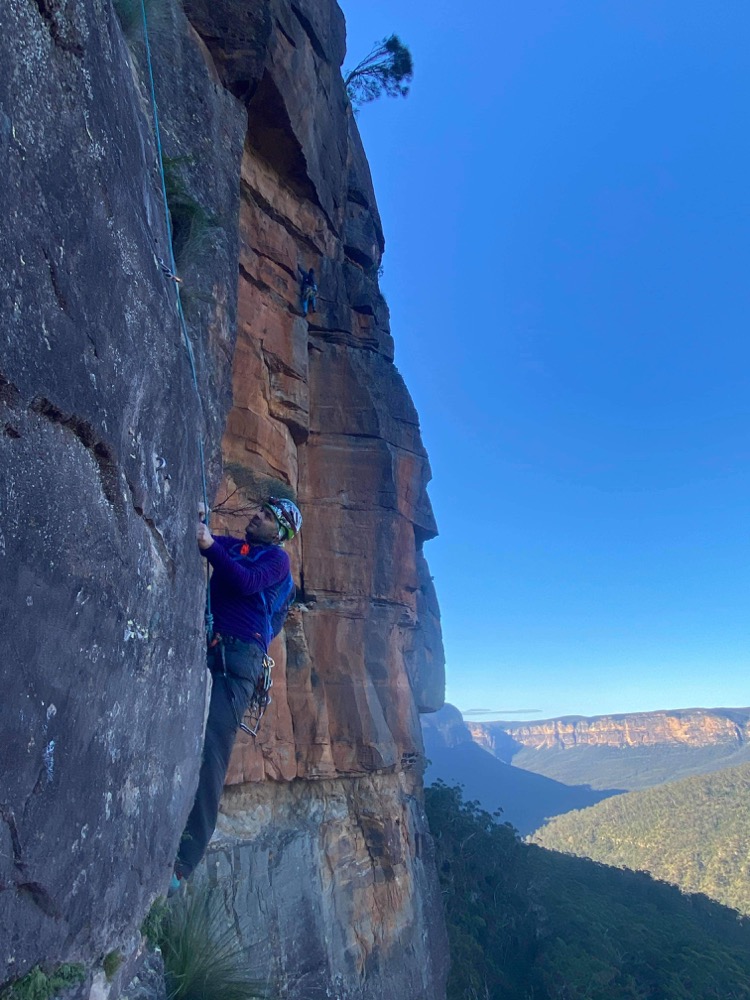 Looking down at Felix at the top of the second last pitch of RRR with the mighty Grose valley views