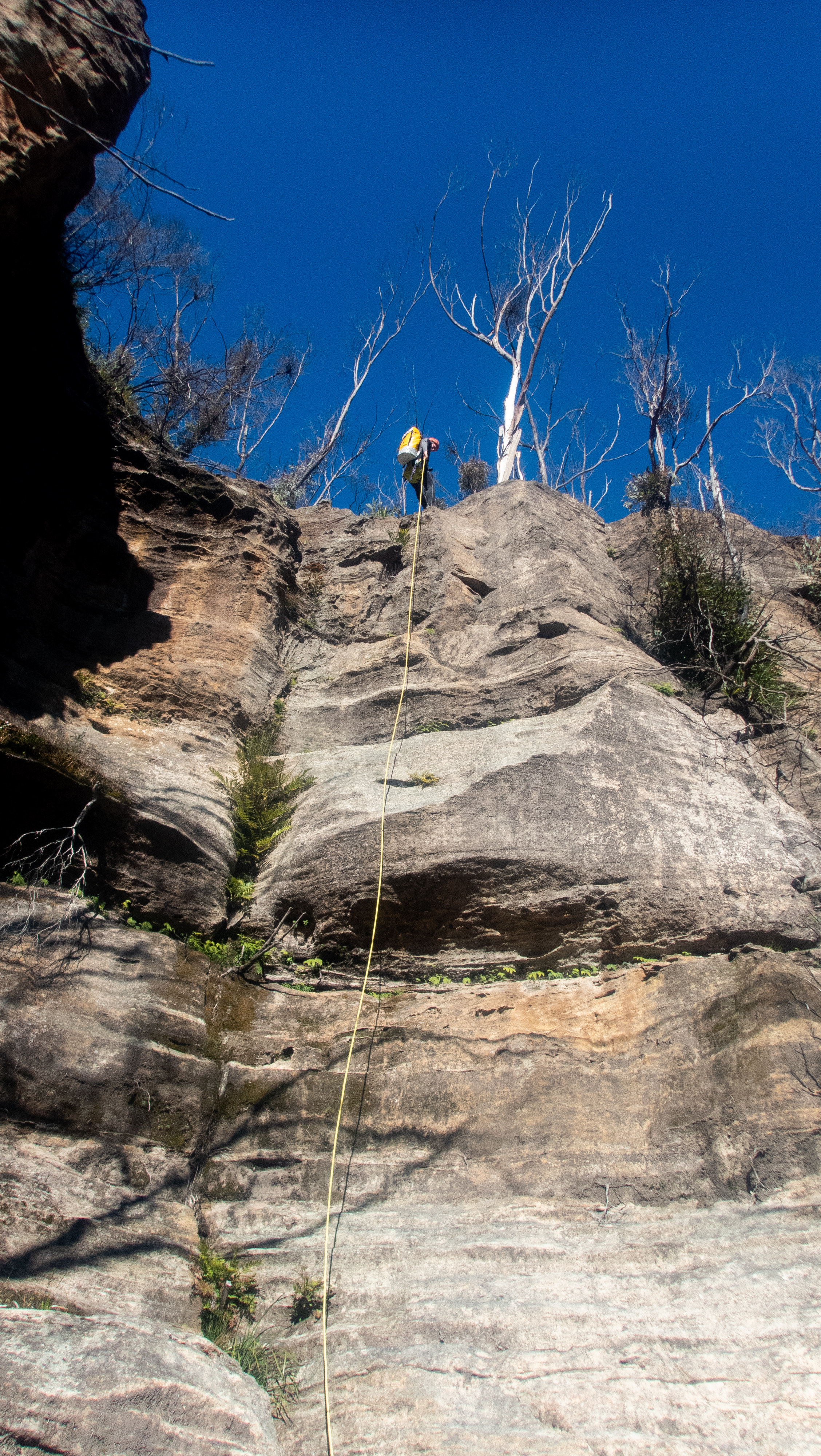 I reach the big ledge. There is 4 or 5 m of rope on the ledge and a large dead tree between me and the edge. Rather than leave a long tail to possibly tangle in the tree I go off rope and signal for the slack to be taken up.