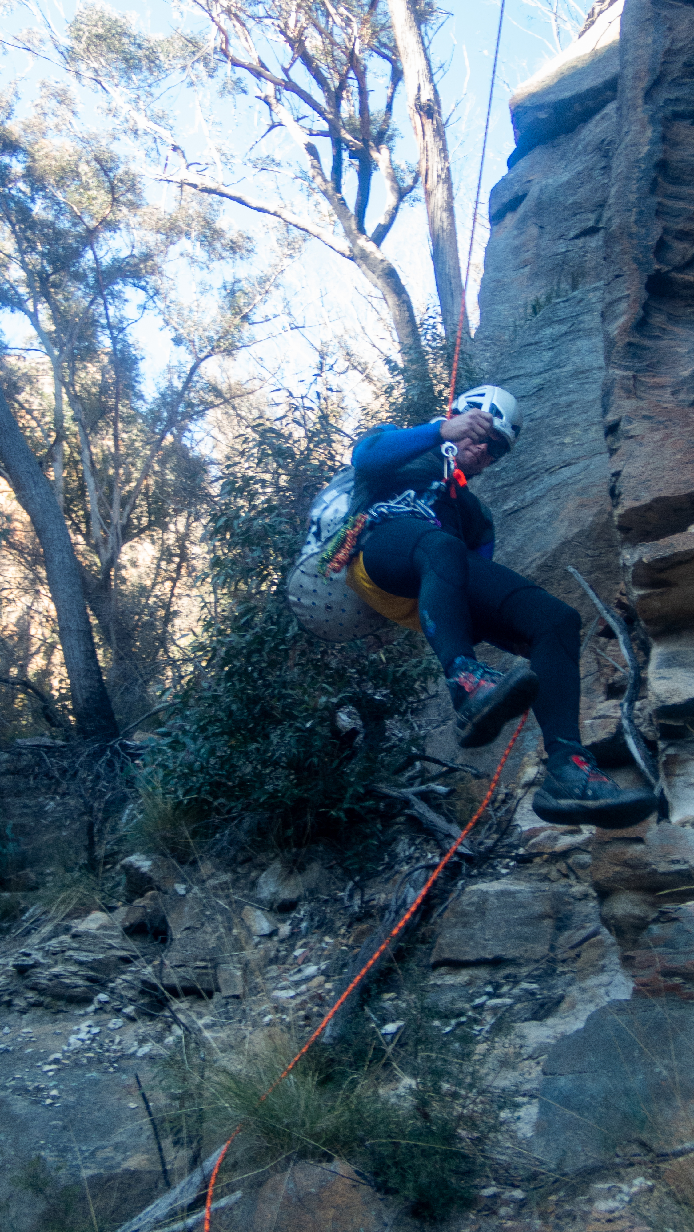 Now back in my misspent youth I may or may not have done some dumbshit(TM) that I don’t condone now. One of those dumbshit(TM) things my brother and I may or maynot have done on the odd occasion was the old Hollywood throw a heap of slack out and jump over the edge trick. So as I slip it’s second nature to me to make sure I have the least amount of friction at the device as I can so when the rope takes up it reduces the shock load as much as possible.