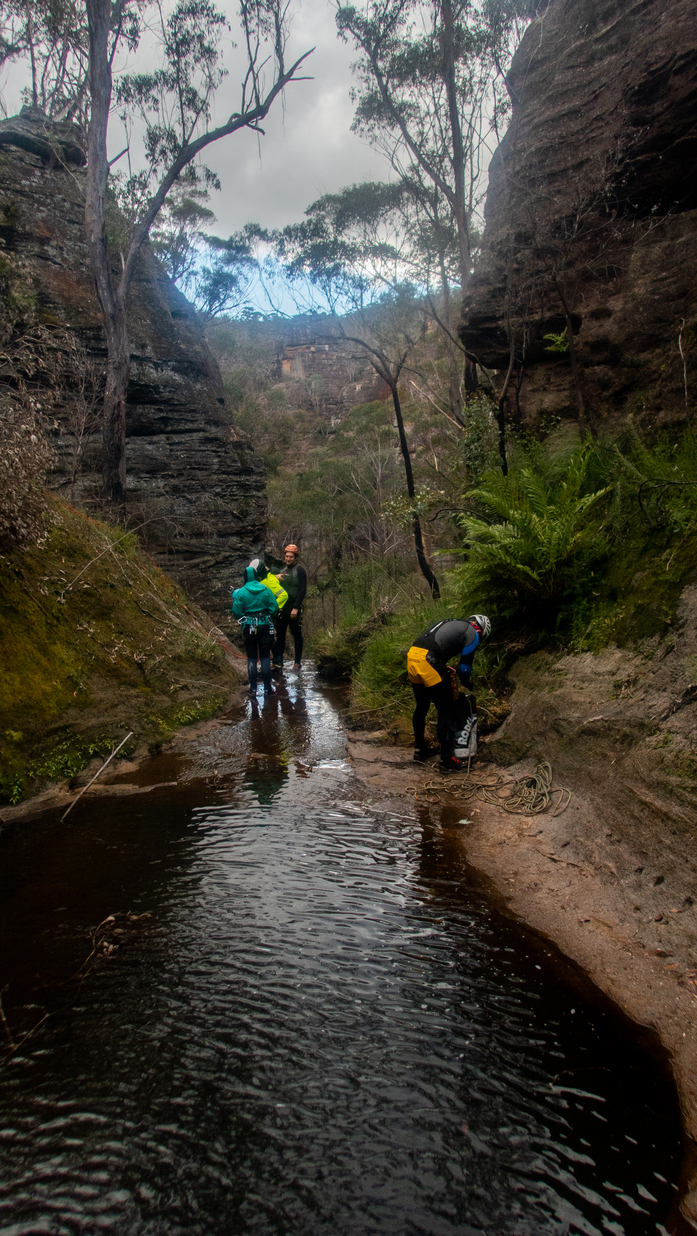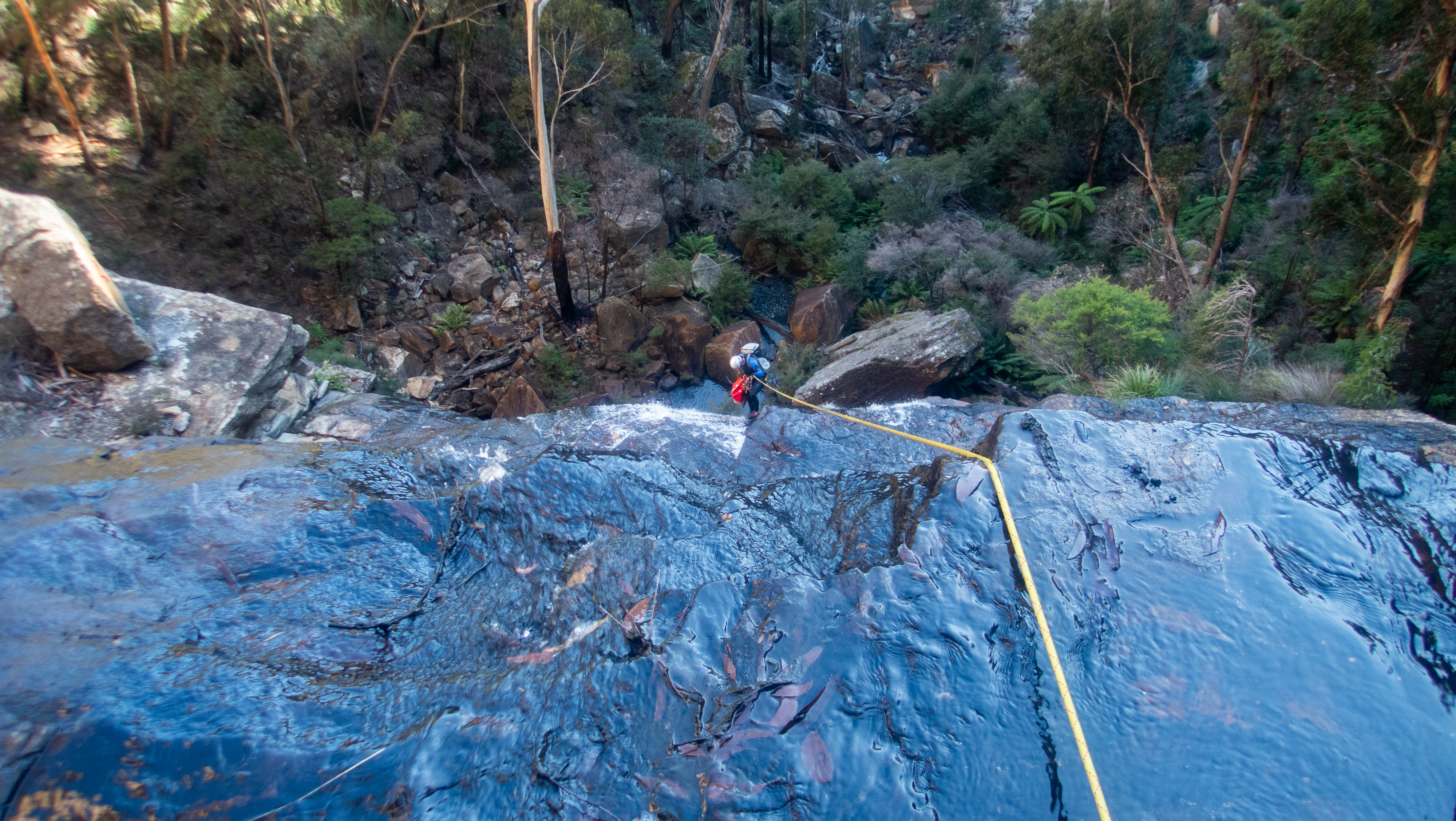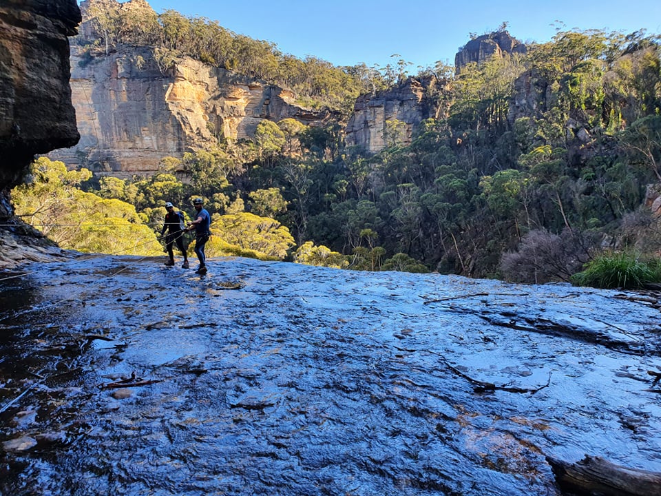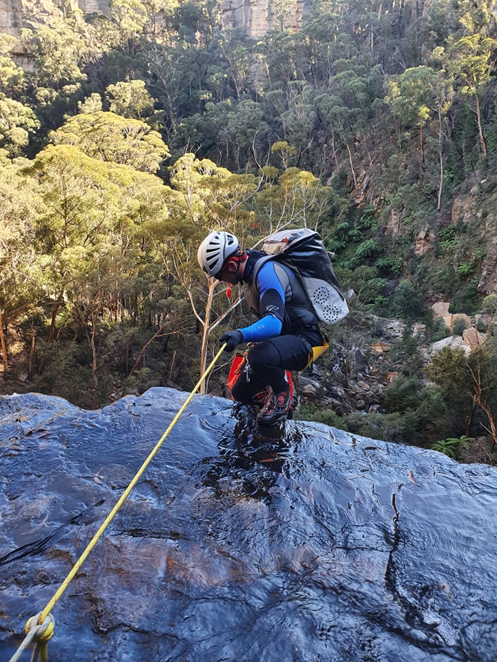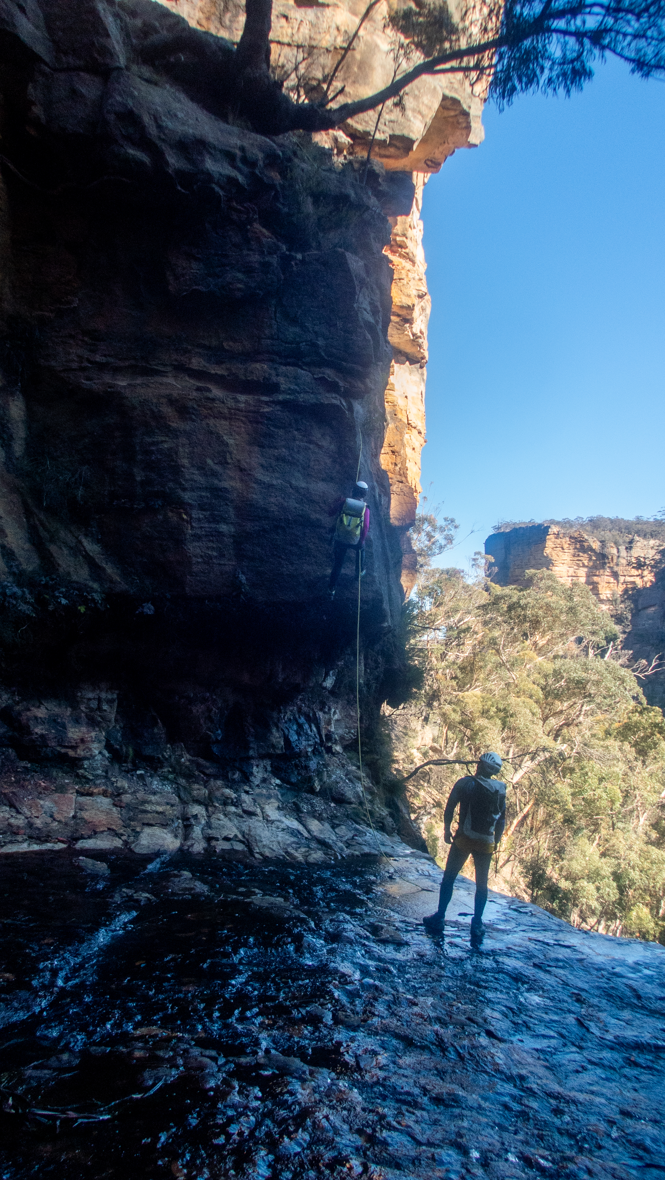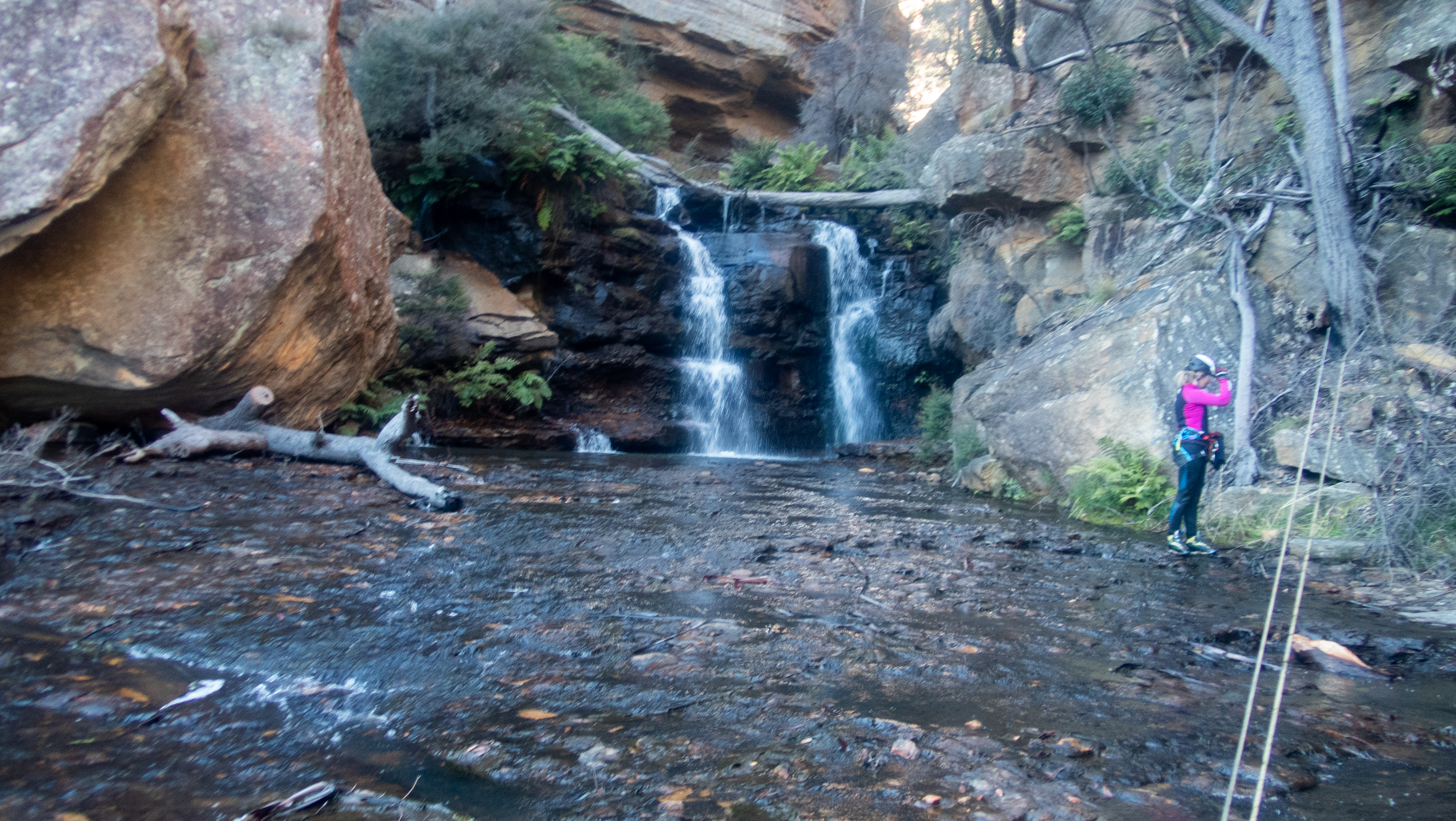 Me and Kylie breifly discuss the abseil. The toppo suggest the falls are 45-50m. My rope is a tad over 50. We left Jason’s 60m in the car. I tie the end of my rope into Aimee’s anchor and toss the end down to see if it will reach. Then try to get to a spot were I can see.