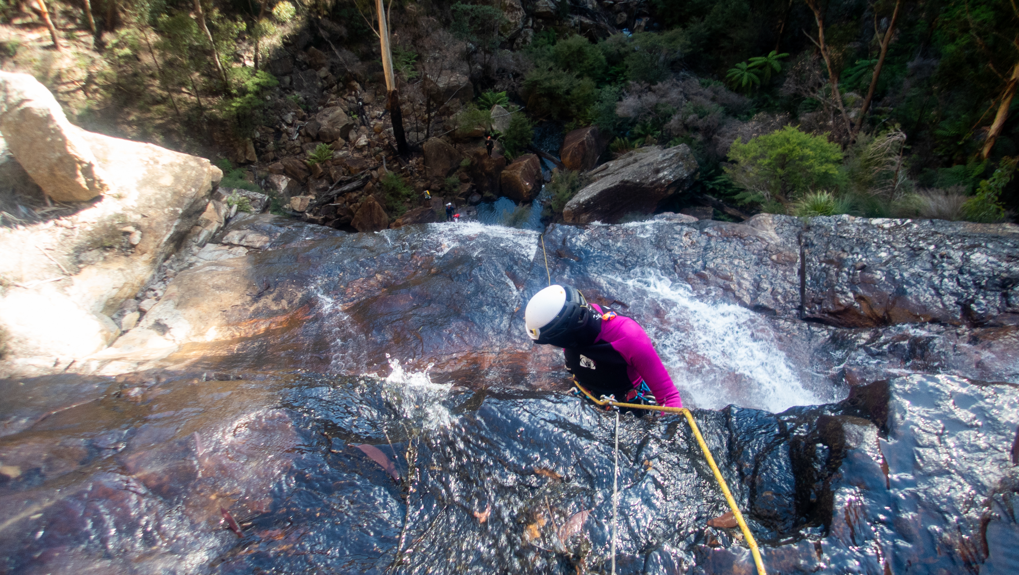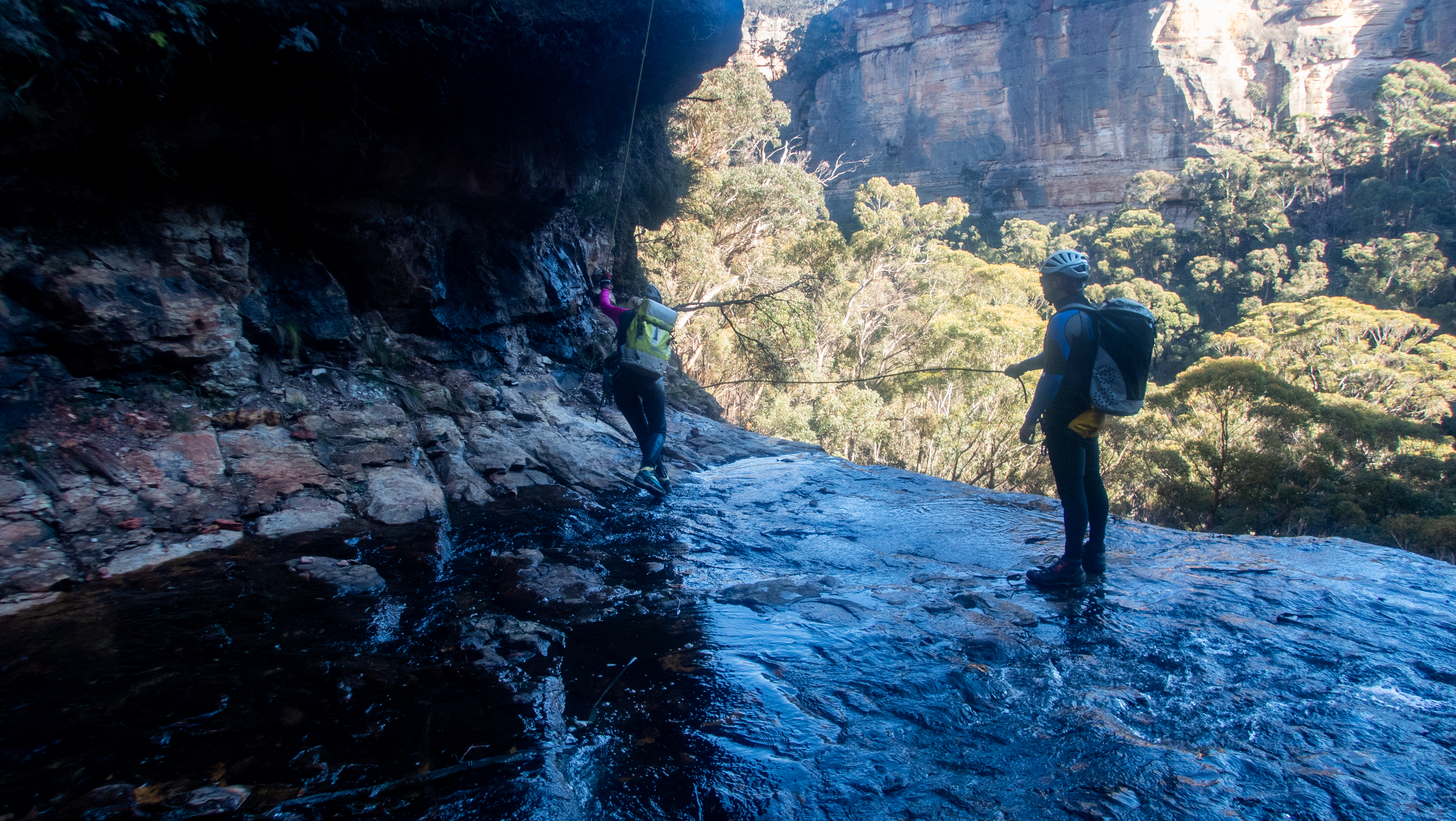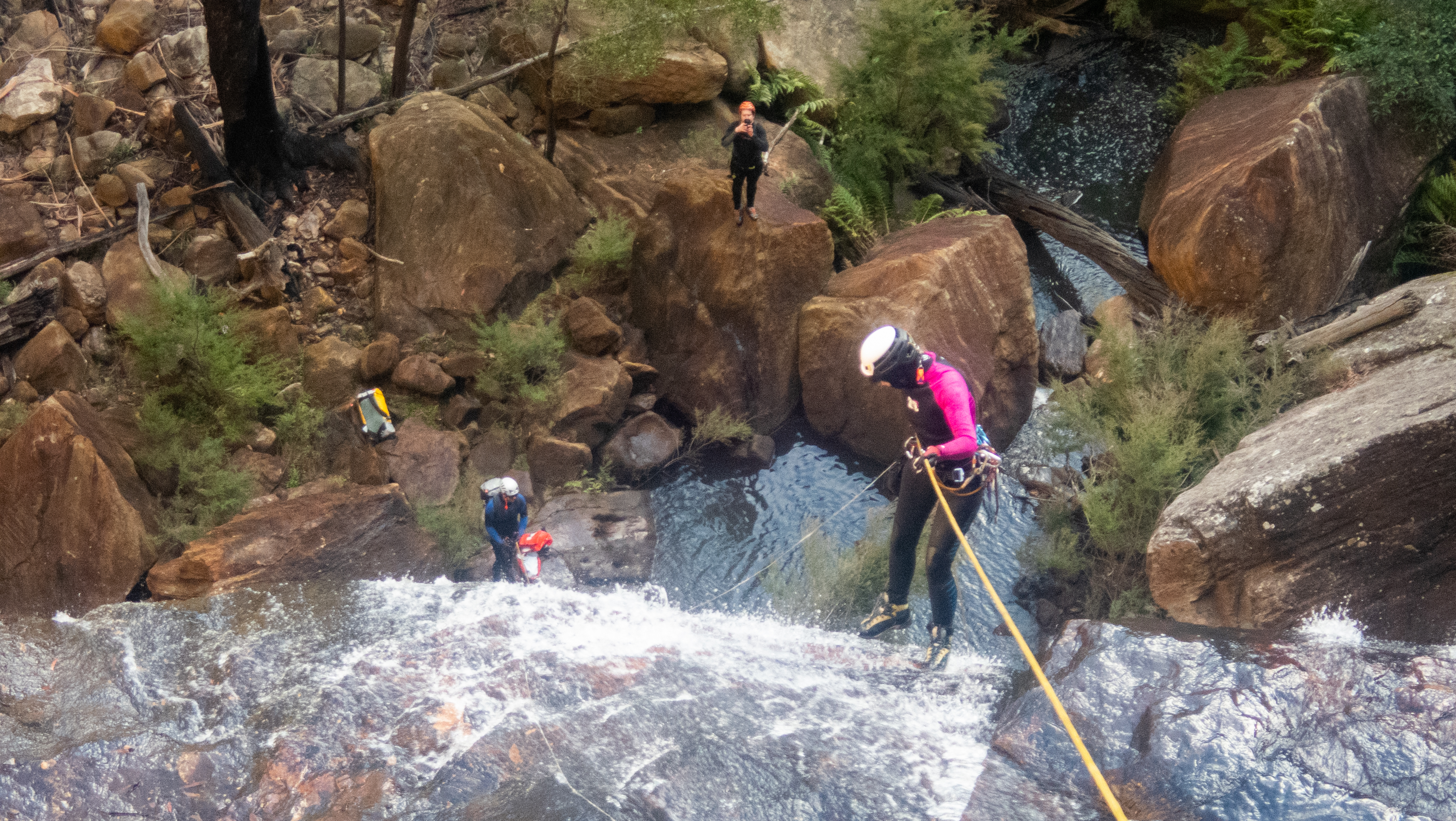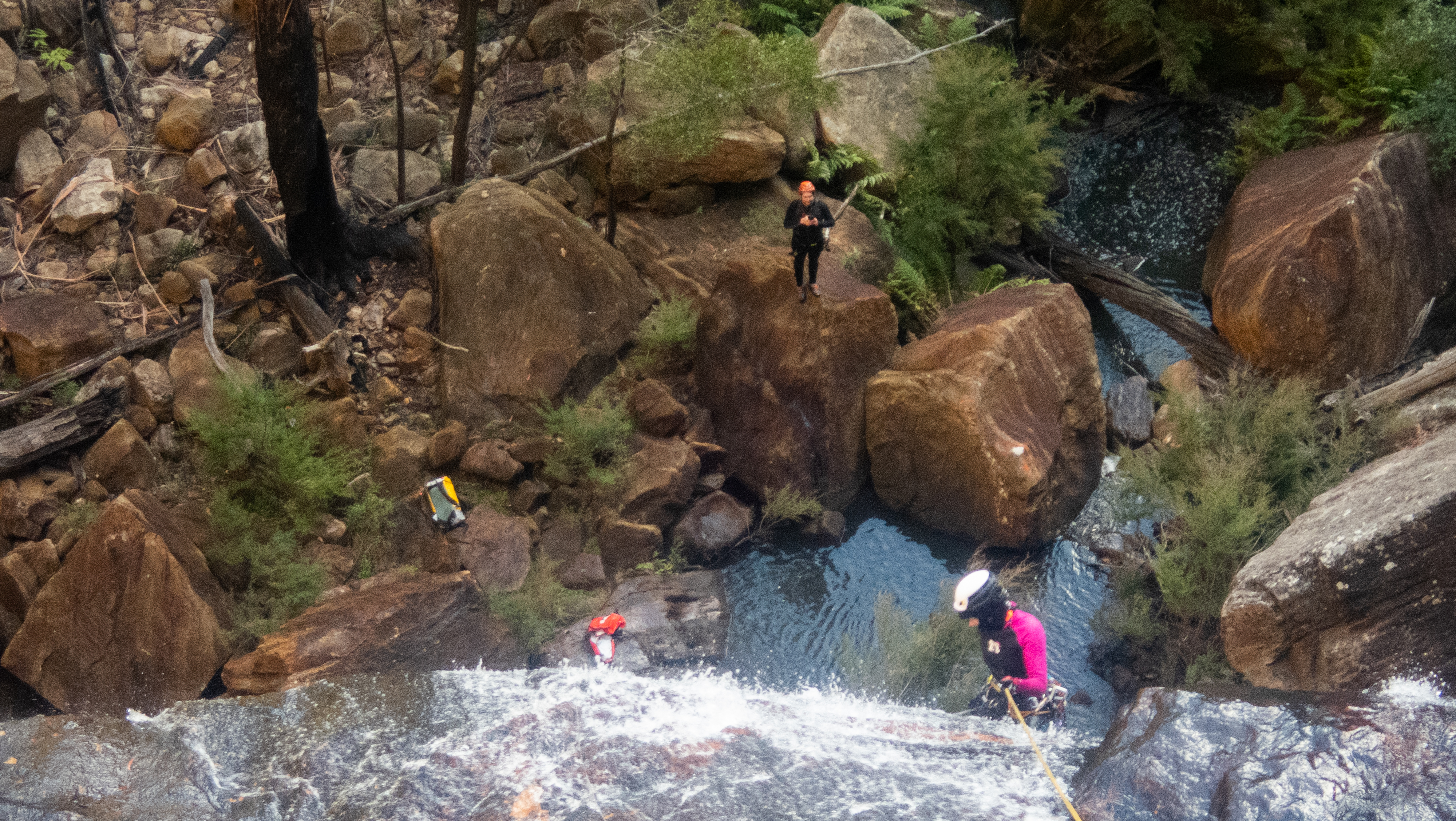 We want to go through the falls and work out a good anchor option. Aimee and Krys get busy setting it up.