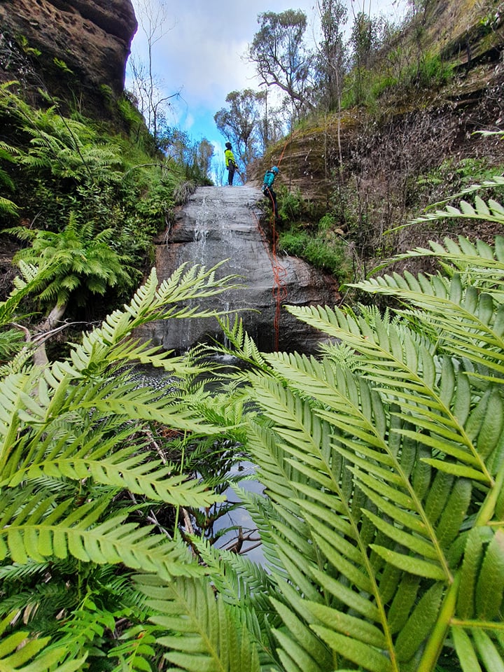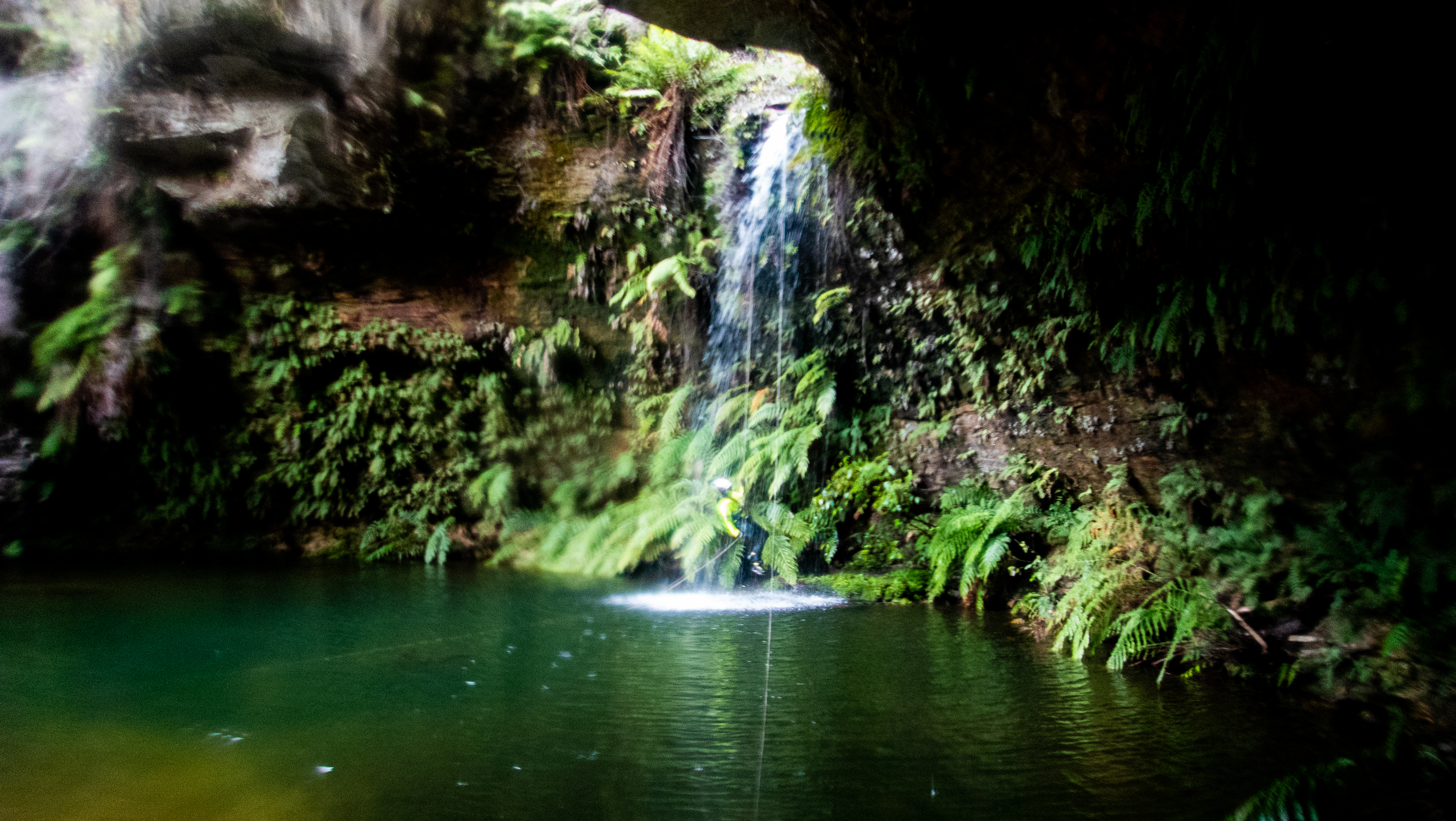 Slippery Start. Then boosh.. I’m into it. It’s pretty much 40-45m of overhanging abseil. You’re in the main flow, then behind it. The wind moves the waterfall meters sidedways and front and back so you are in it then not in it then bam! back in.