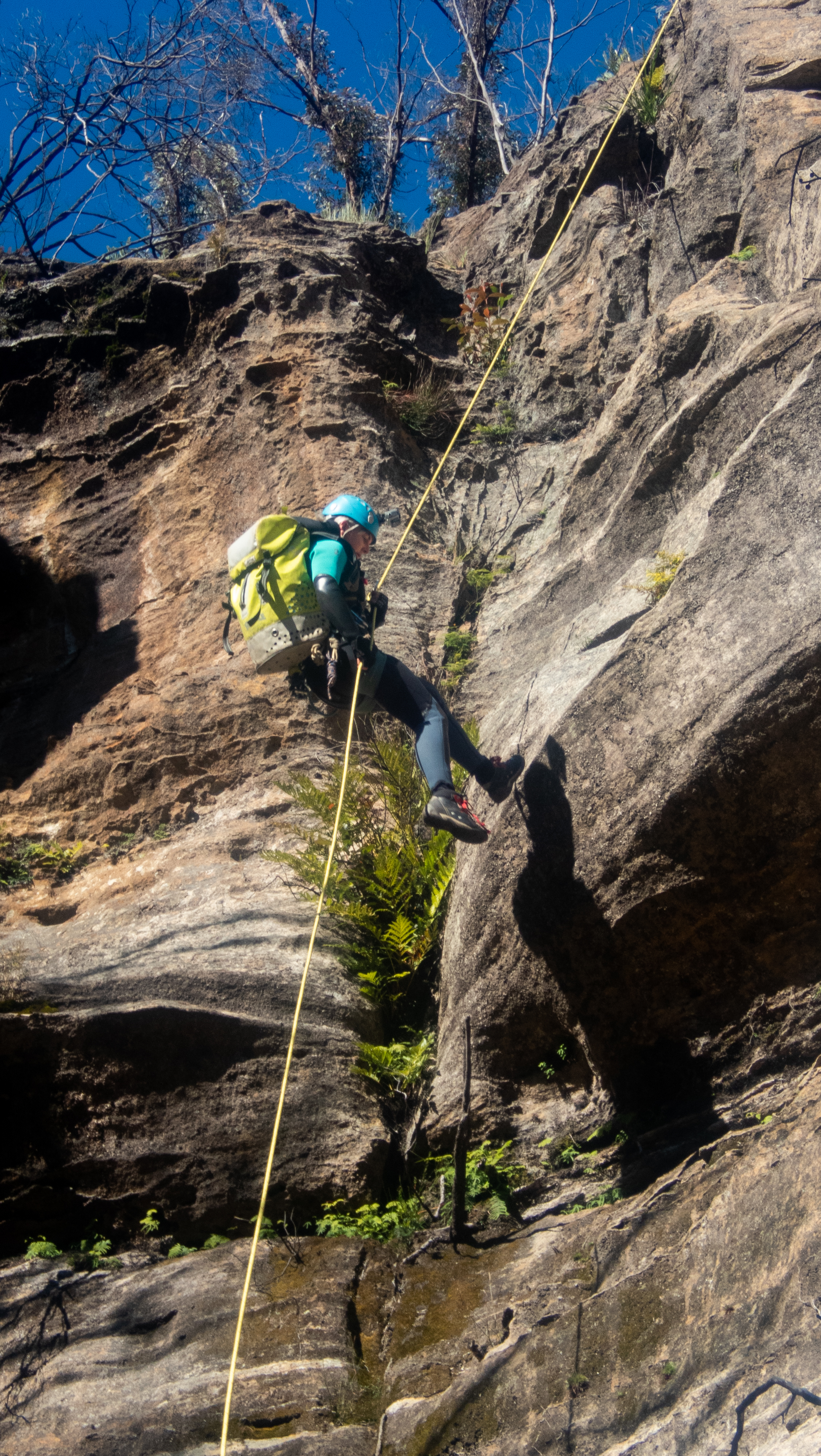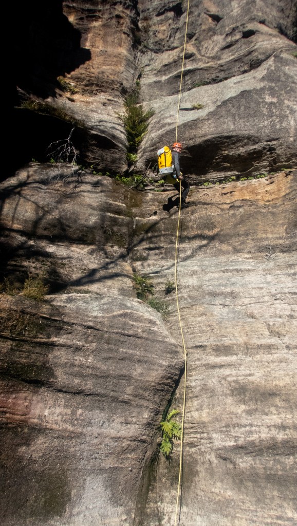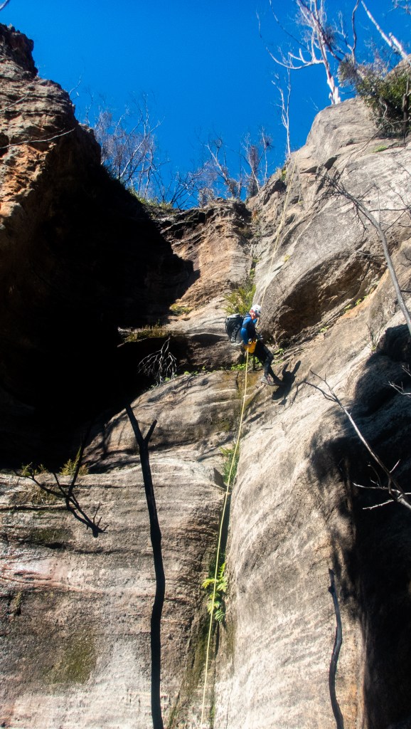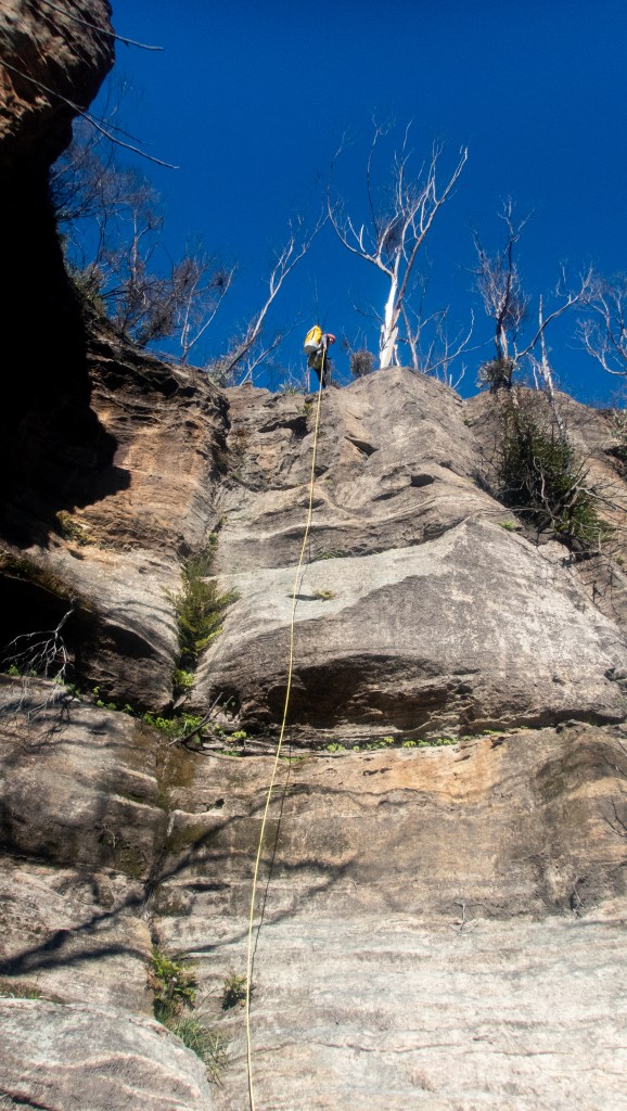 Meanwhile, down below I’ve joined the ropes and tossed the end down. Rookie error, I don’t keep hold of the rope and the angle takes it out away from me. Gingerly leaning over the dead tree I grab the rope and pull it back to me.