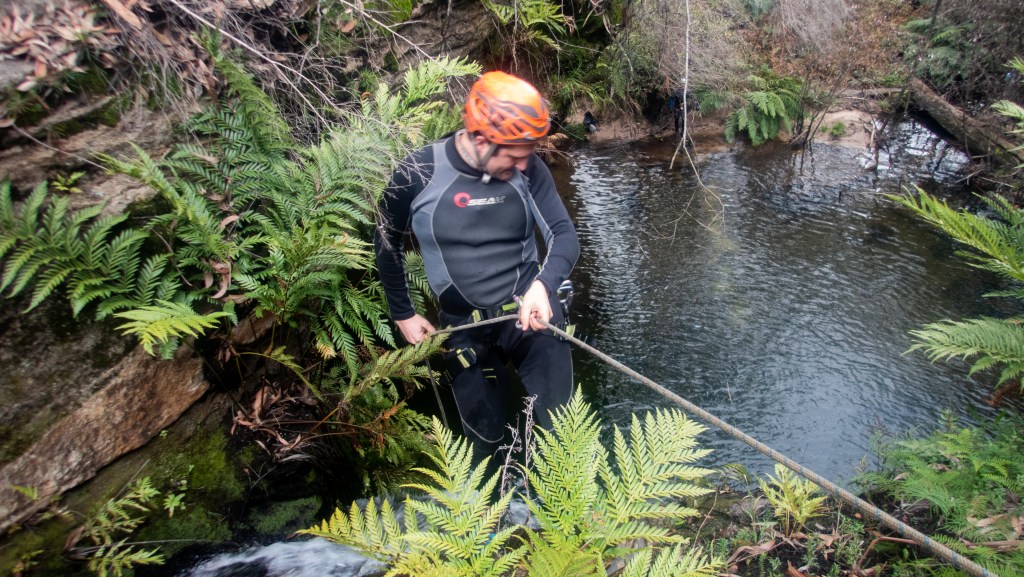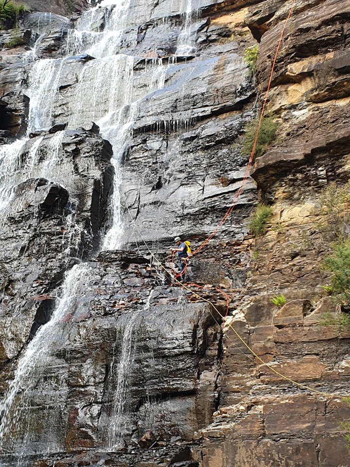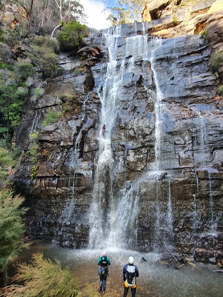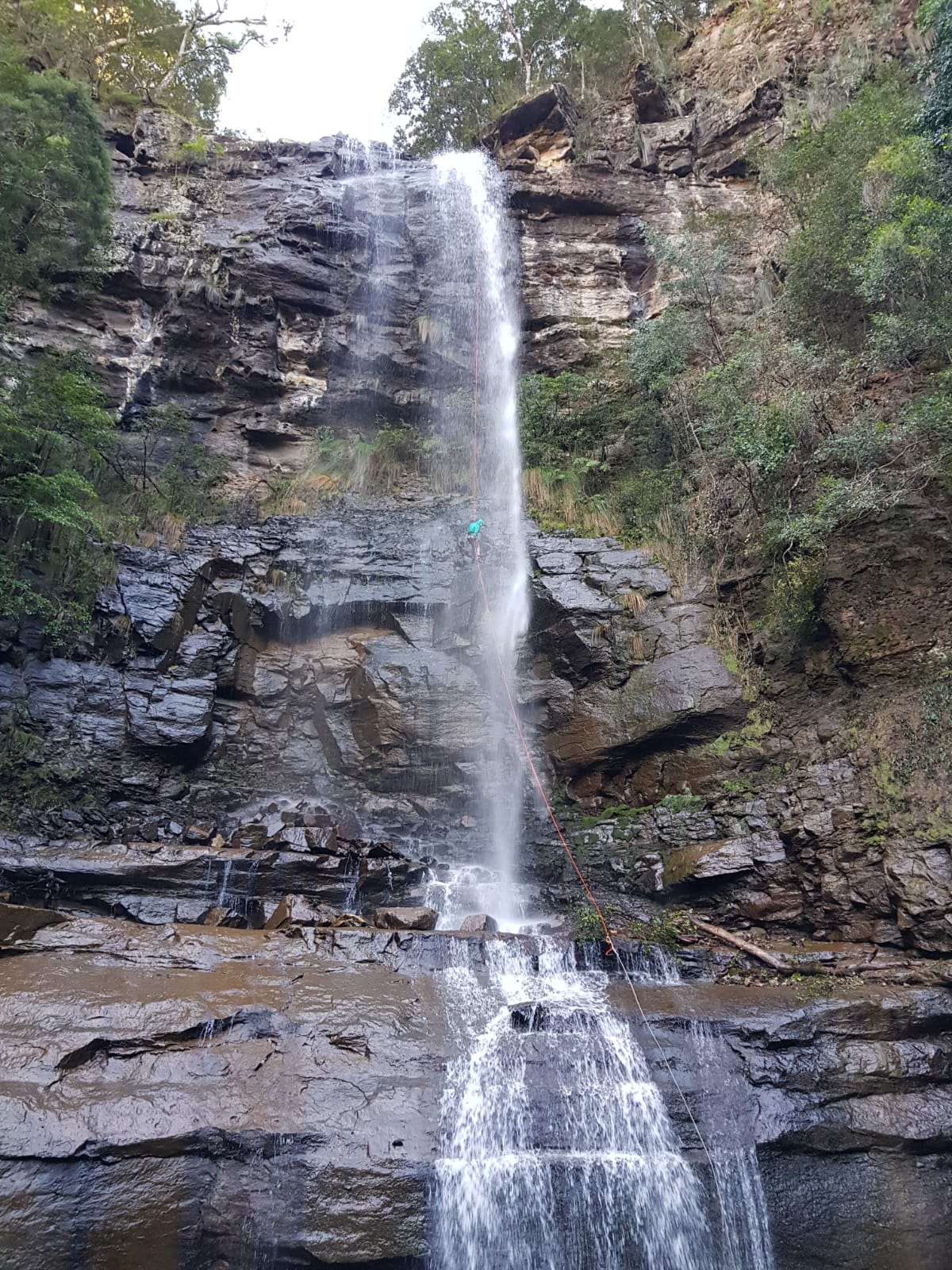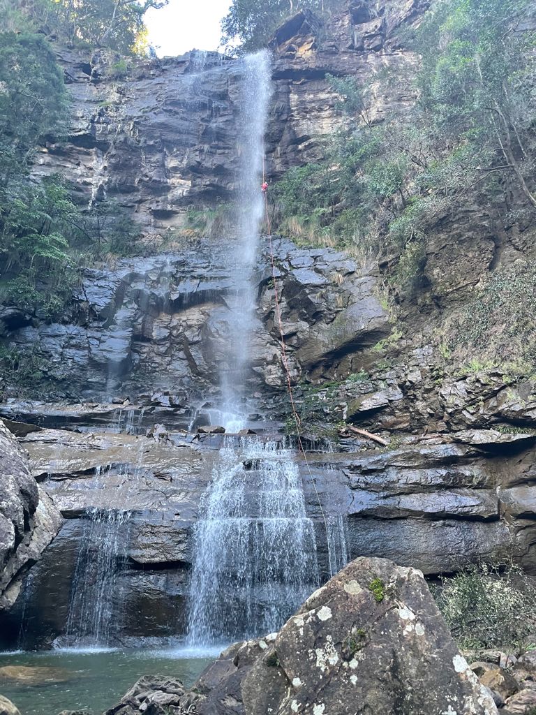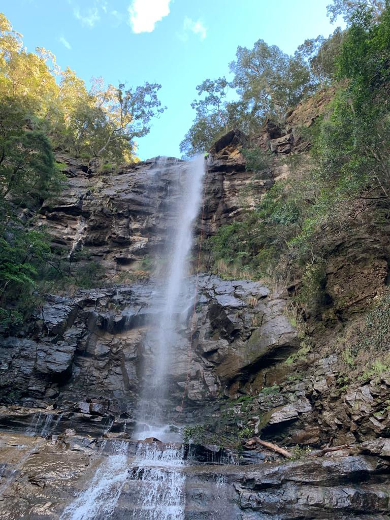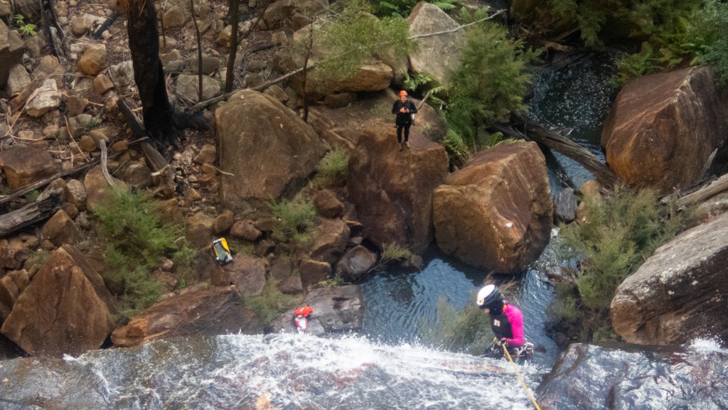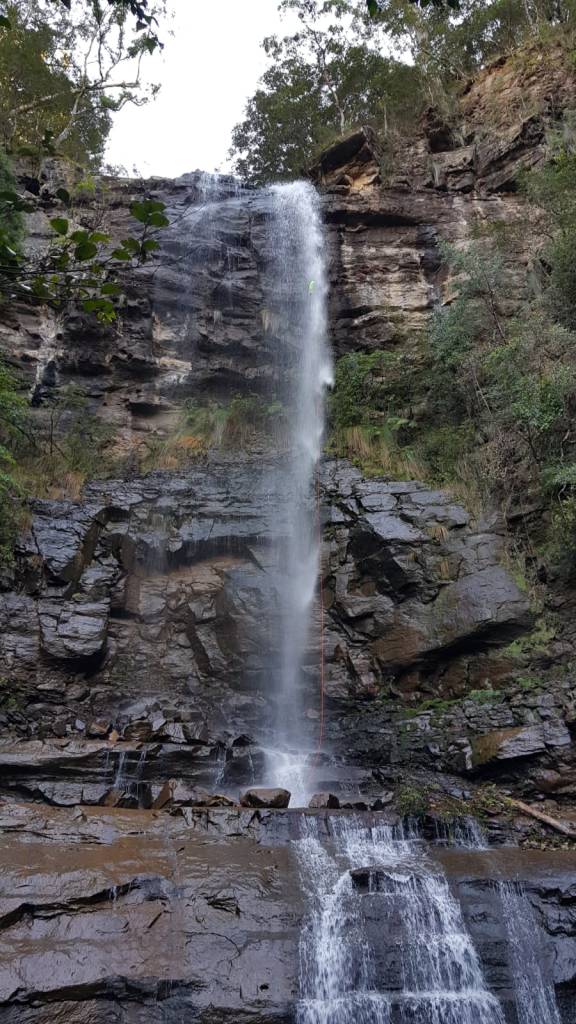 We know there is a large ledge about 10m from the bottom but I can’t see it. Kylie suggests first person down takes the spare rope and if possible joins the two at the ledge so that we are not needing to pass a knot mid abseil in what is going to be very cold water spray.