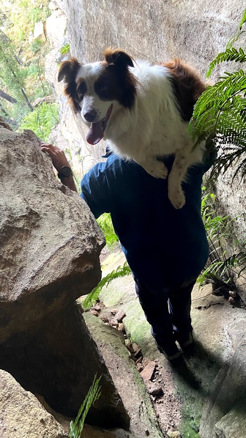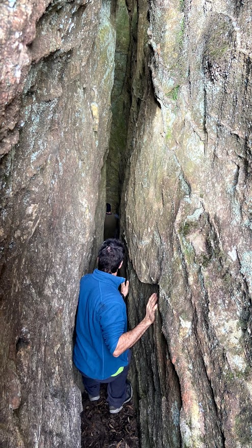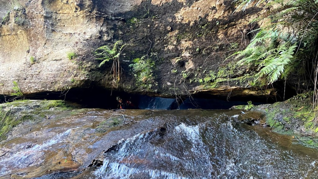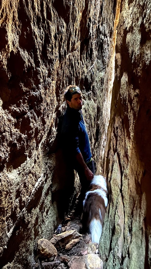 So I squeeze. I strip of clothing. I try bridging higher. I can’t bend me knees to get lower….. There is just 1 bit where I can’t get past. If memory serves there is one more tight bit further in so rather than forcing myself through and possibly getting stuck further in I opt to reverse out, with some difficultly and let the young skinny beautiful doggo continue through with Madie and Leo…..
