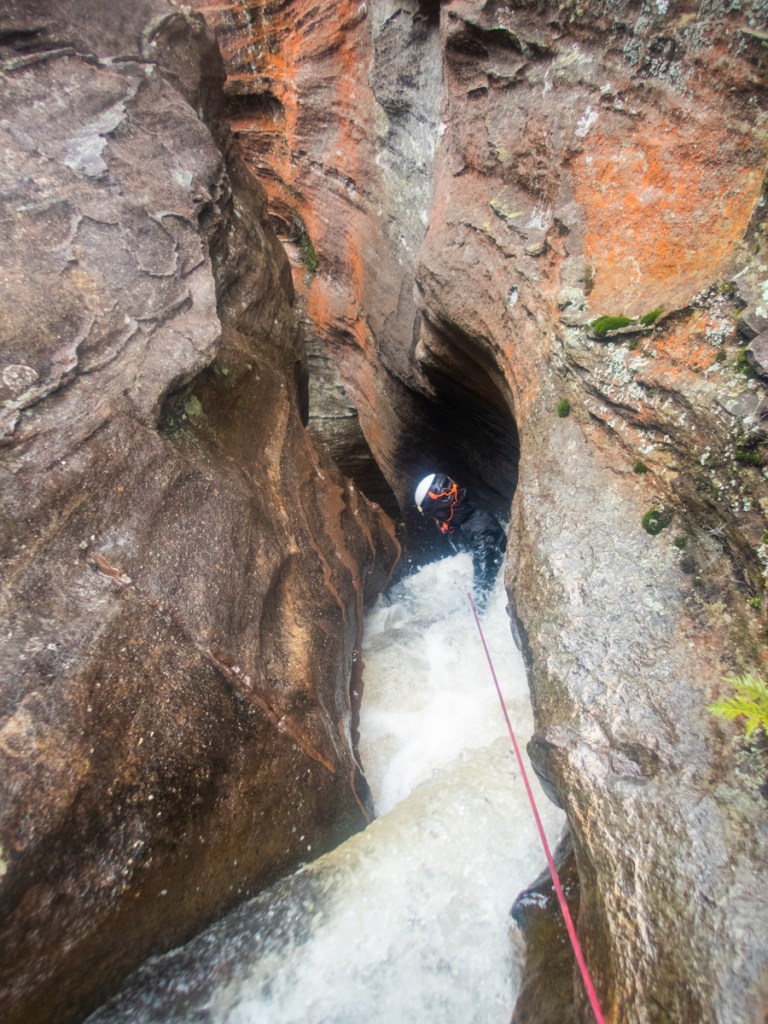 My only concern now was that the water coming across the shelf above the falls might make it tricky getting off rope on the standard line that required you to swing in to land on the shelf.