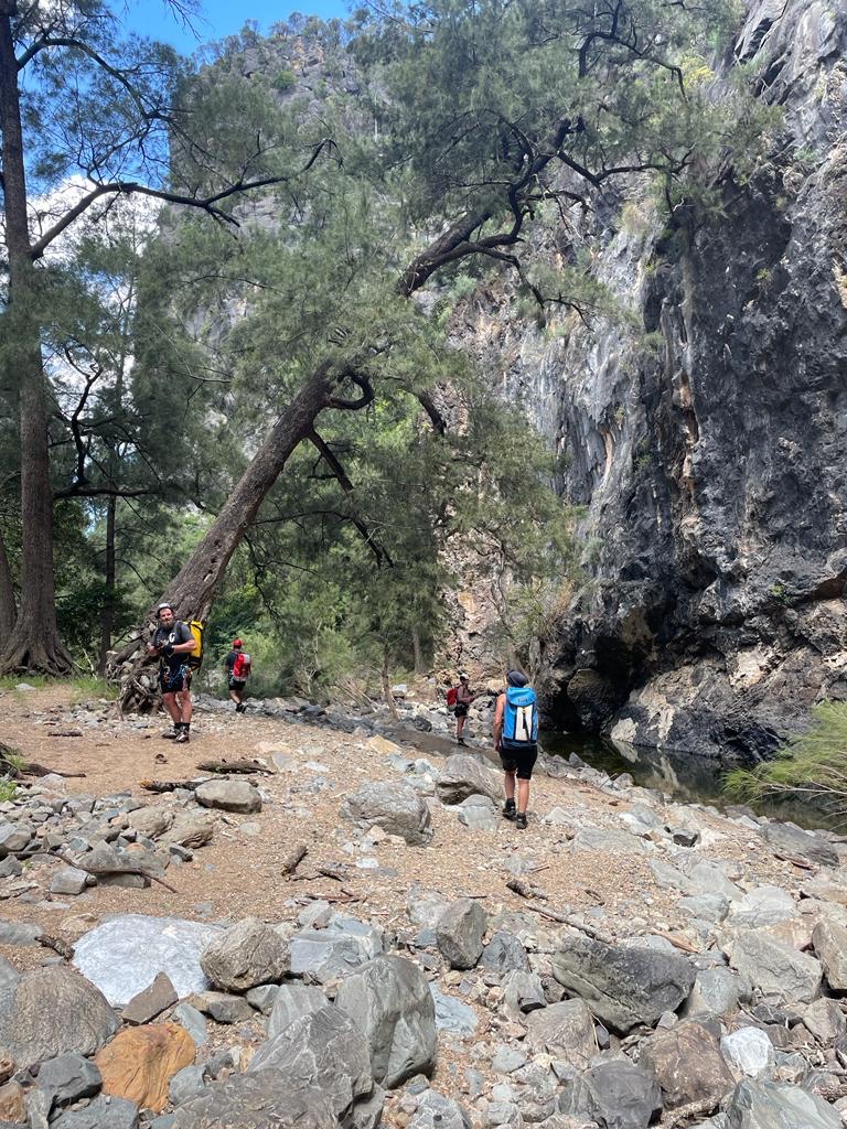 There had been some discussion about taking one of the short cut exits. But given the choice between scrambling up an exposed, loose knife edge in the baking sun or boulder hoping down and walking up the tourist track at a slightly cooler time of day everyone opted tourist track