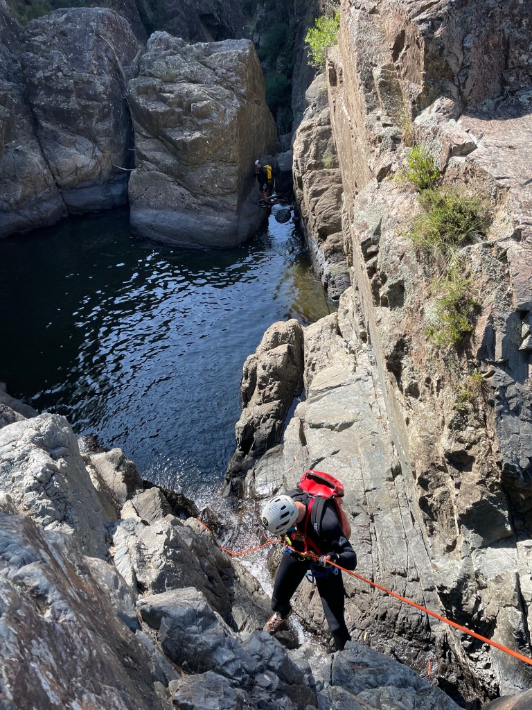 We opt for a sling on a tree up to the left. This gives us about a 42m abseil into the pool below.