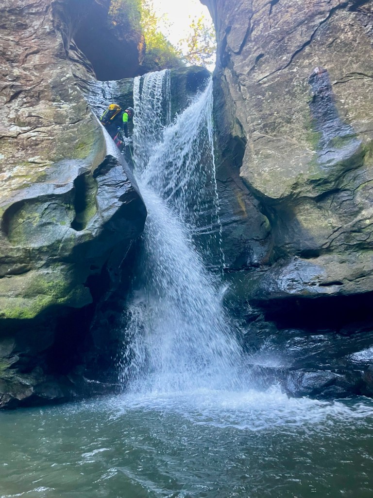 A 20m abseil brings us to a big ledge. That was hidden at the top.