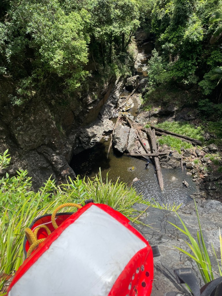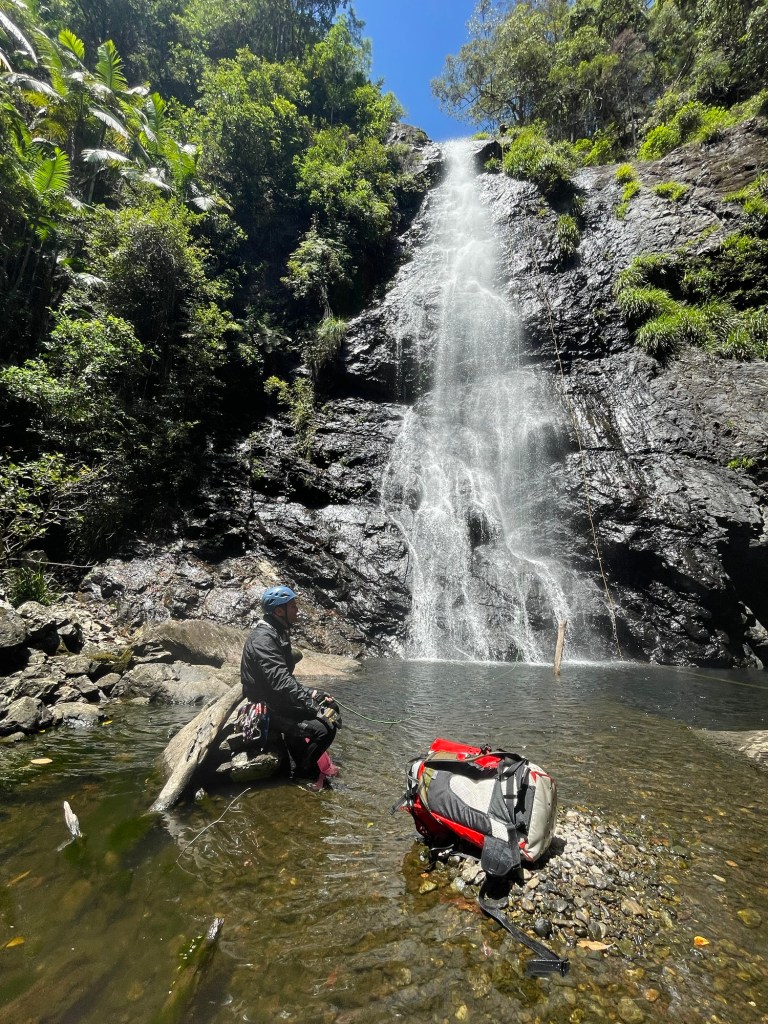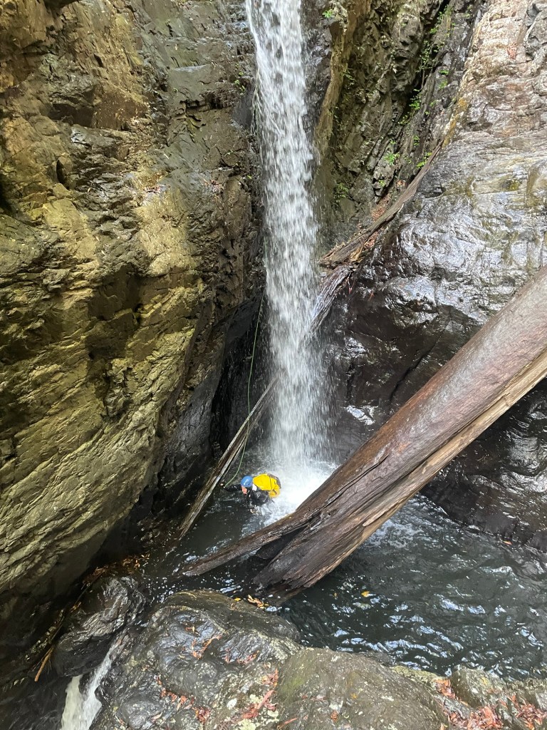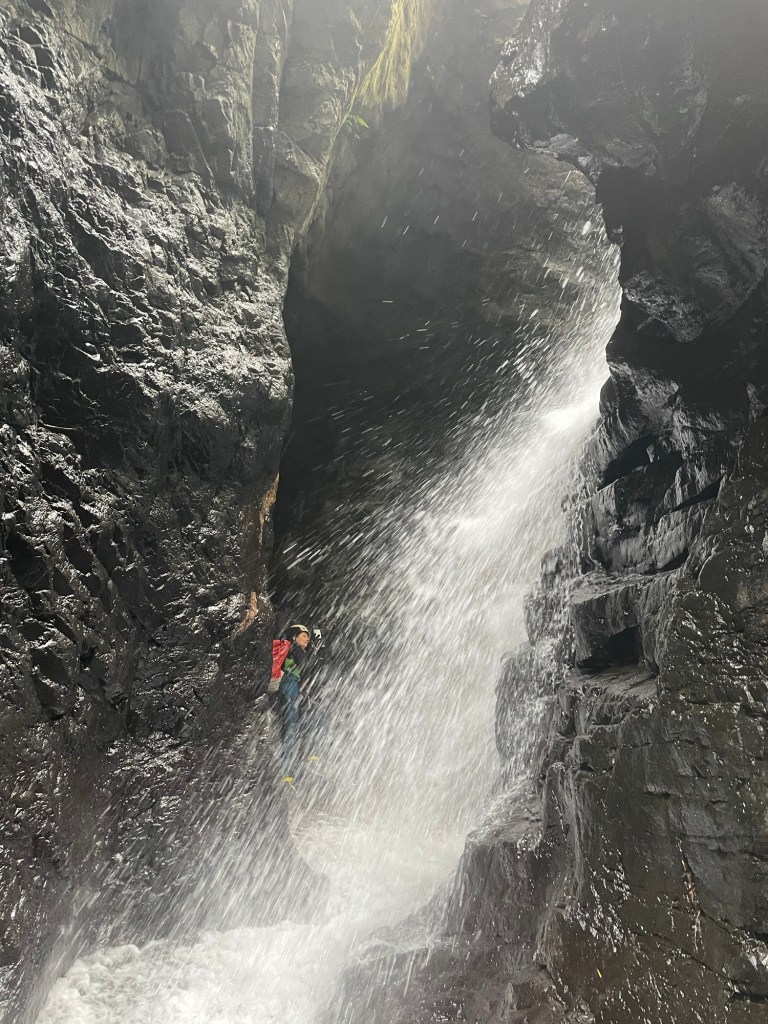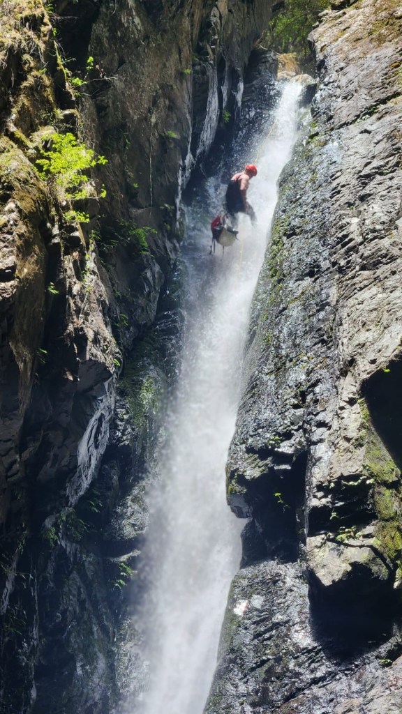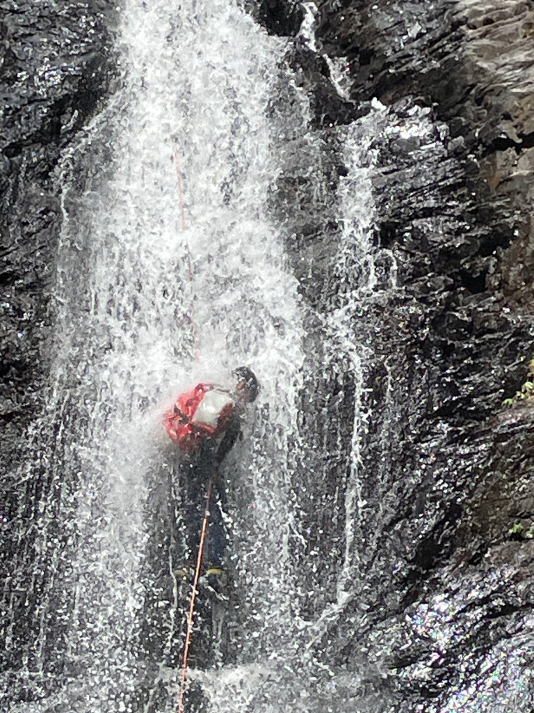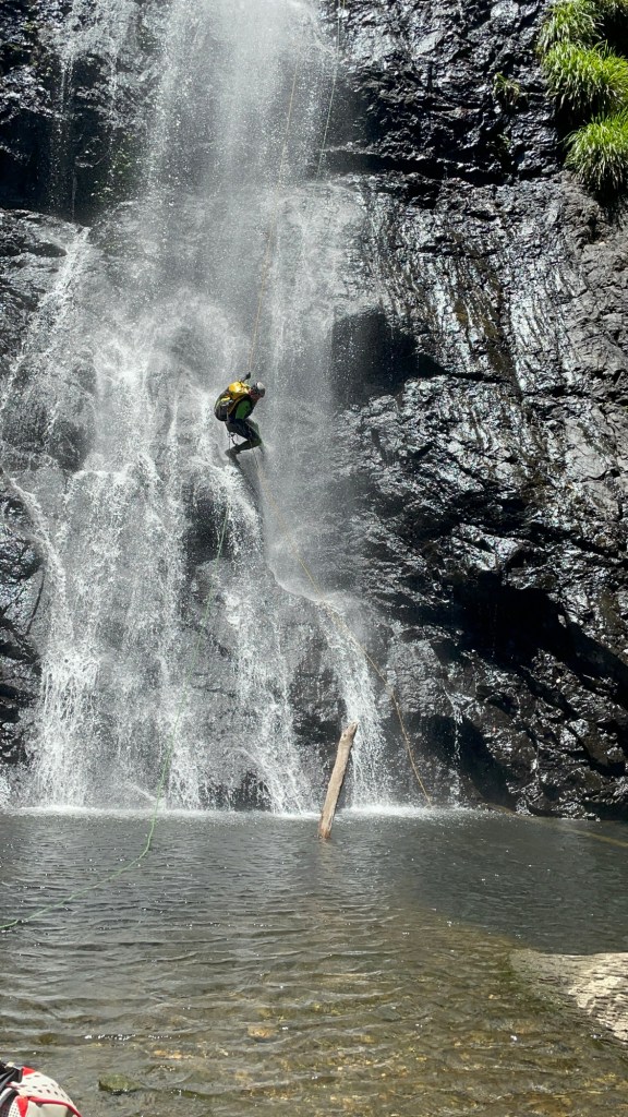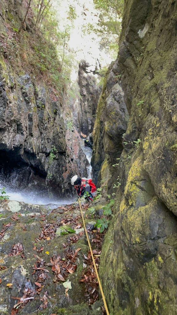 We get to the first drop. Setting up the rope I somehow ended up with an overhand knot around the anchor. I shrug at Vince. I’m really good at this canyoning caper, honest. says I