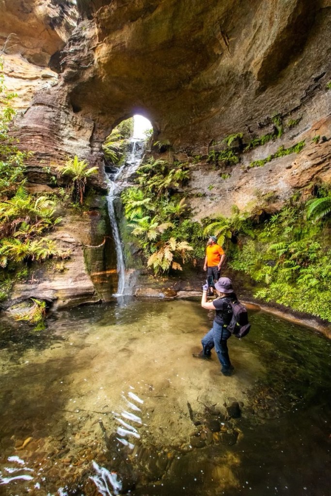 Again the canyon opens out. We believe it’s a 1km scrub bash down to the next bit so, happy with our easy day, we retrace our steps back up to the waterfall. A crowd of people are here now.