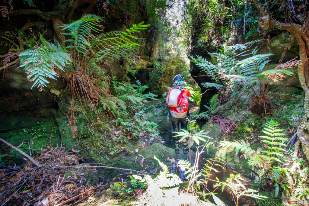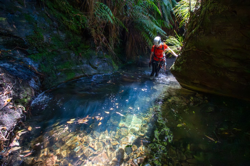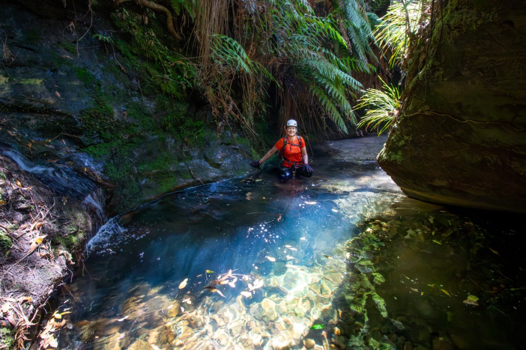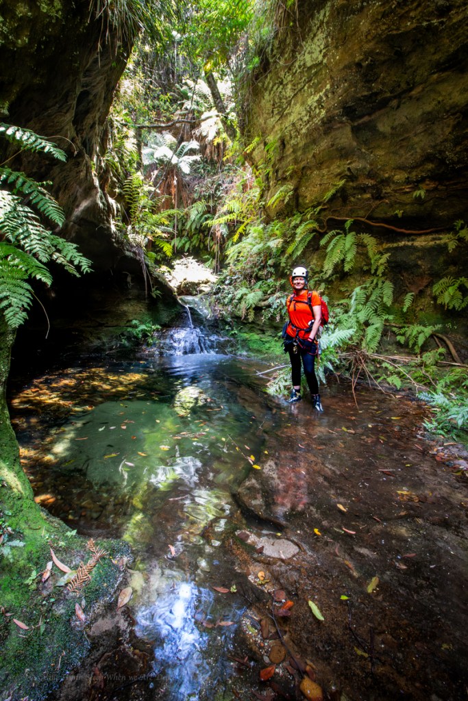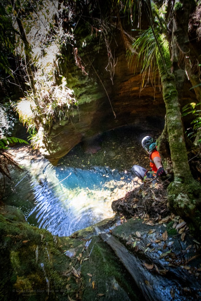 Water levels looks low so scrambling over the slippery walls may prove difficult and we couldn’t see if the tight duck under was clear so we opted to by pass over the top and abseil in the side.