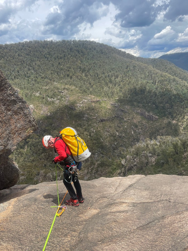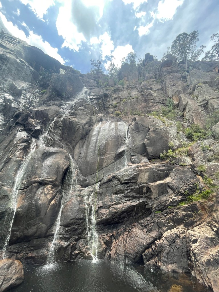 We set up and Joel leads the way down. We have about 76m of rope out and by the time he gets to the next big ledge and traverses across to the rebelay there is maybe 3m of tail left.