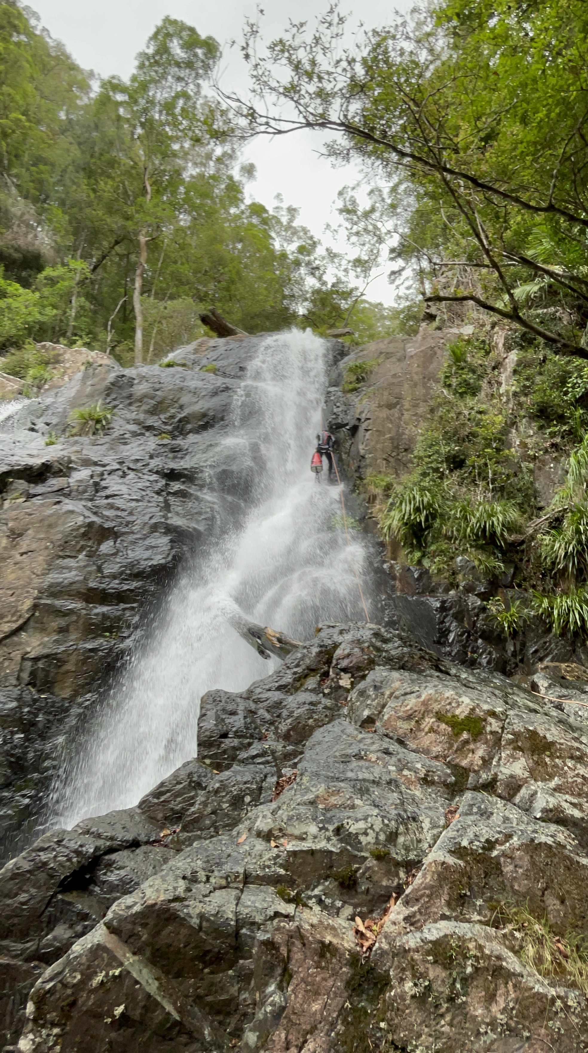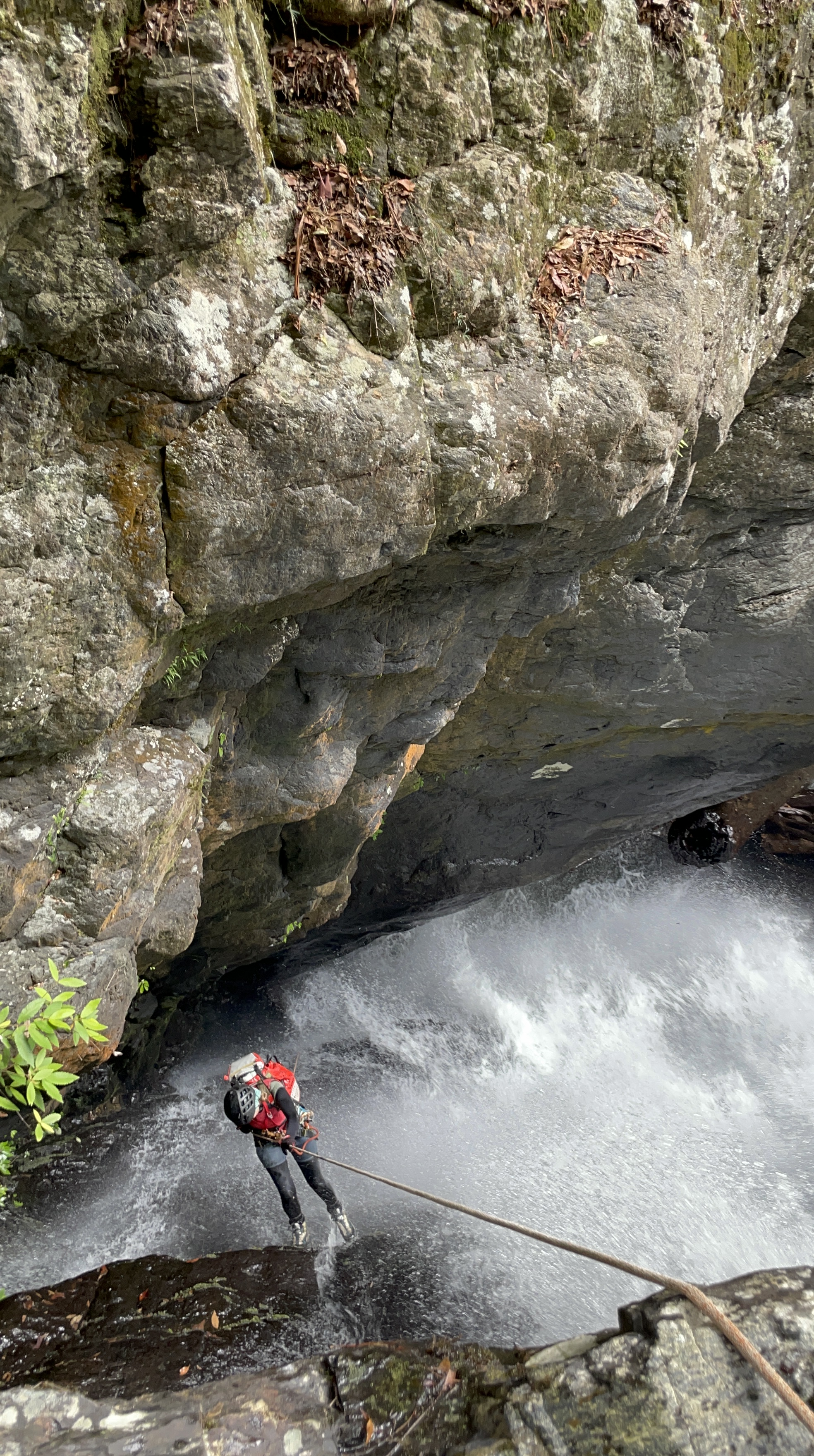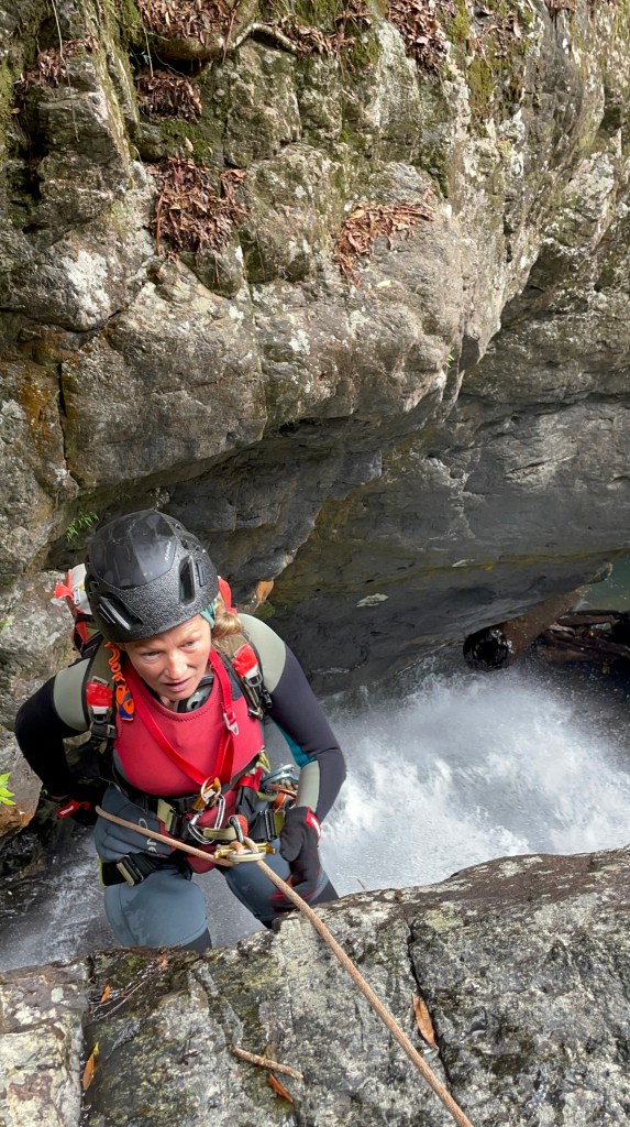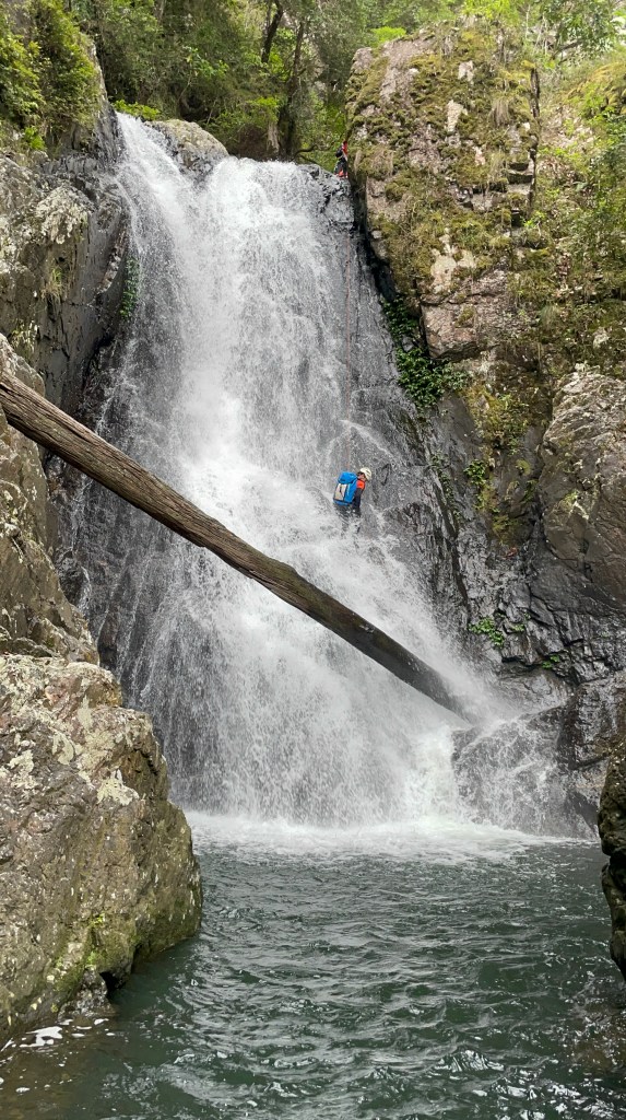 we get to the infamous drop that goes down through a massive log, last time we have avoided the hazard using the bolted traverse. this time we followed Jasons advice and cross to creek right and abseils off a tree. Much simpler