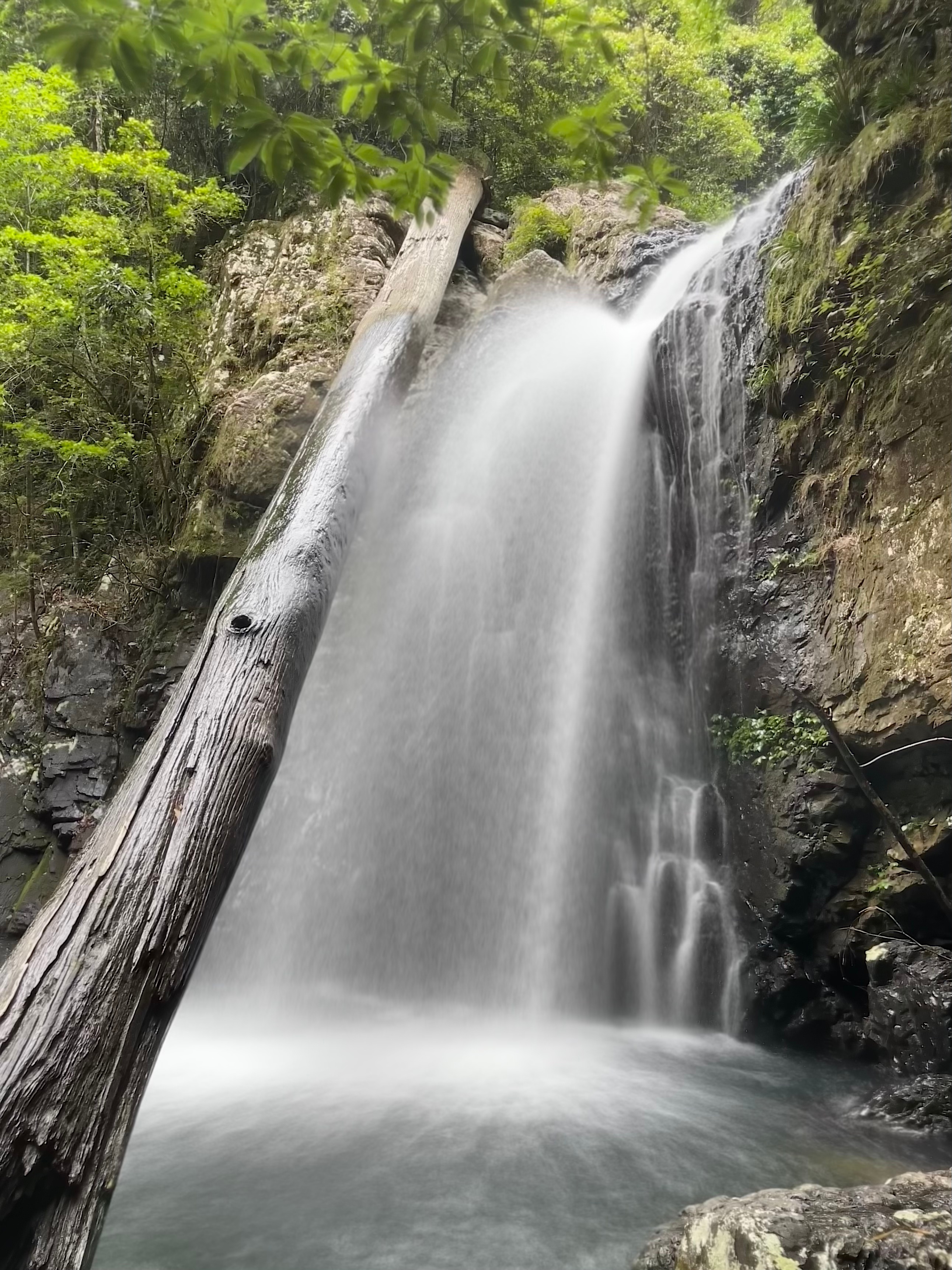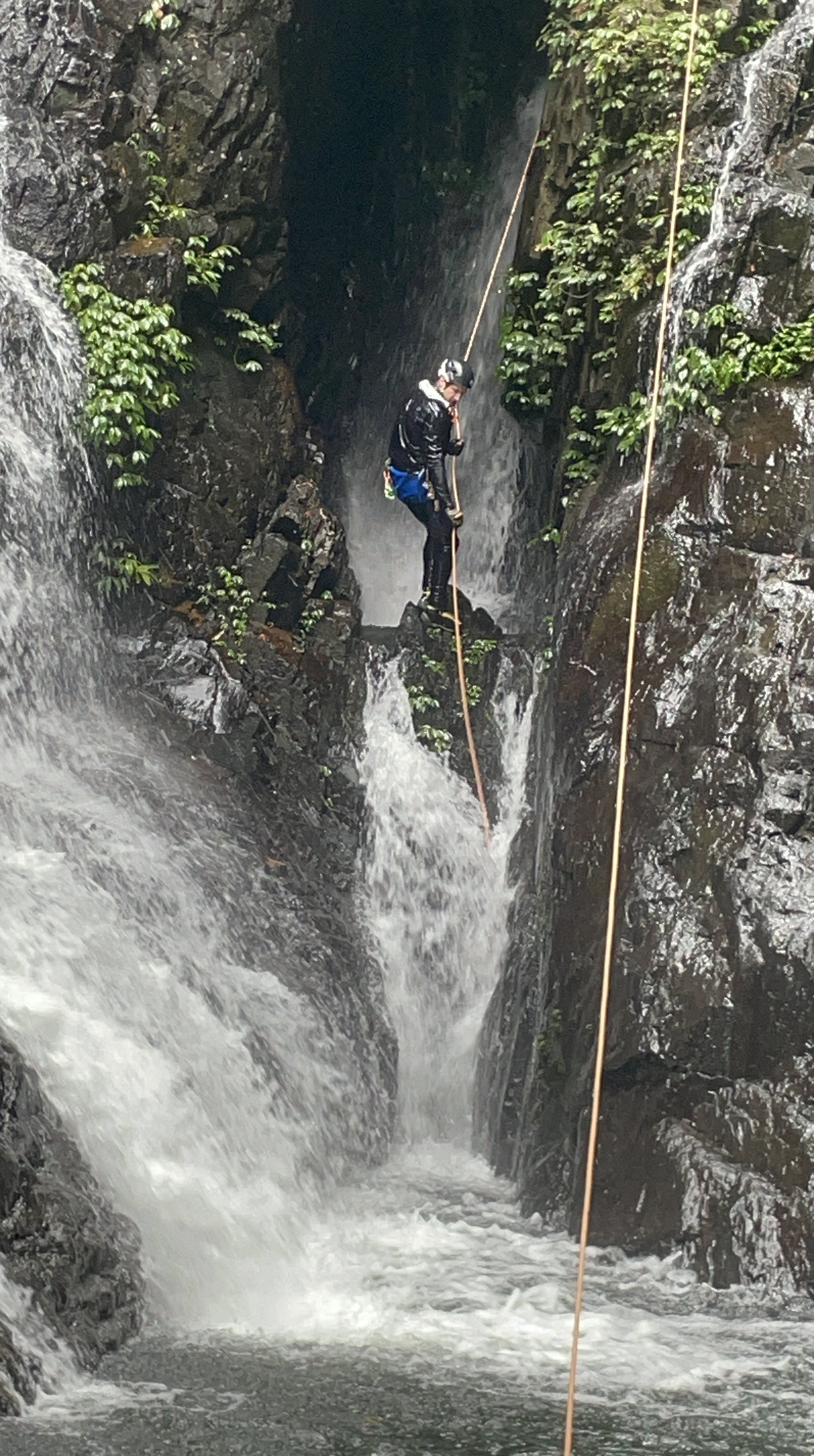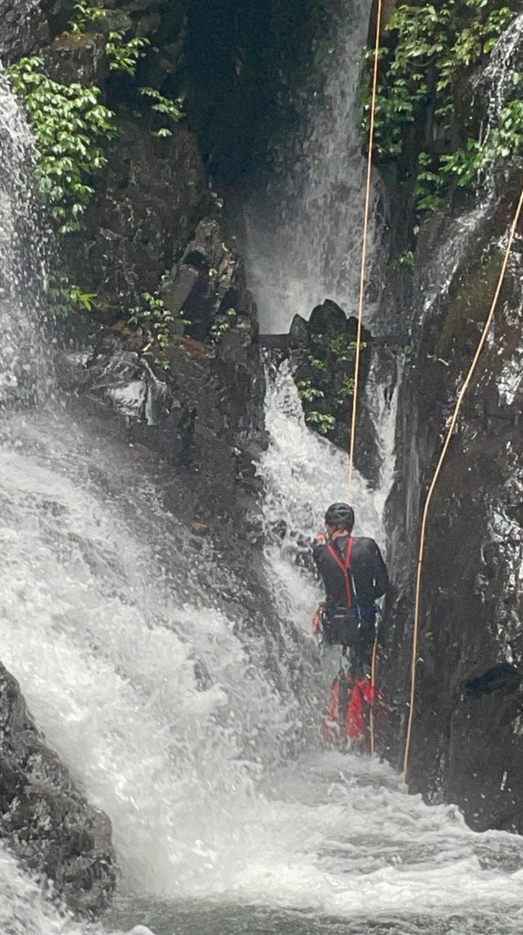 we get to the infamous drop that goes down through a massive log, last time we have avoided the hazard using the bolted traverse. this time we followed Jasons advice and cross to creek right and abseils off a tree. Much simpler