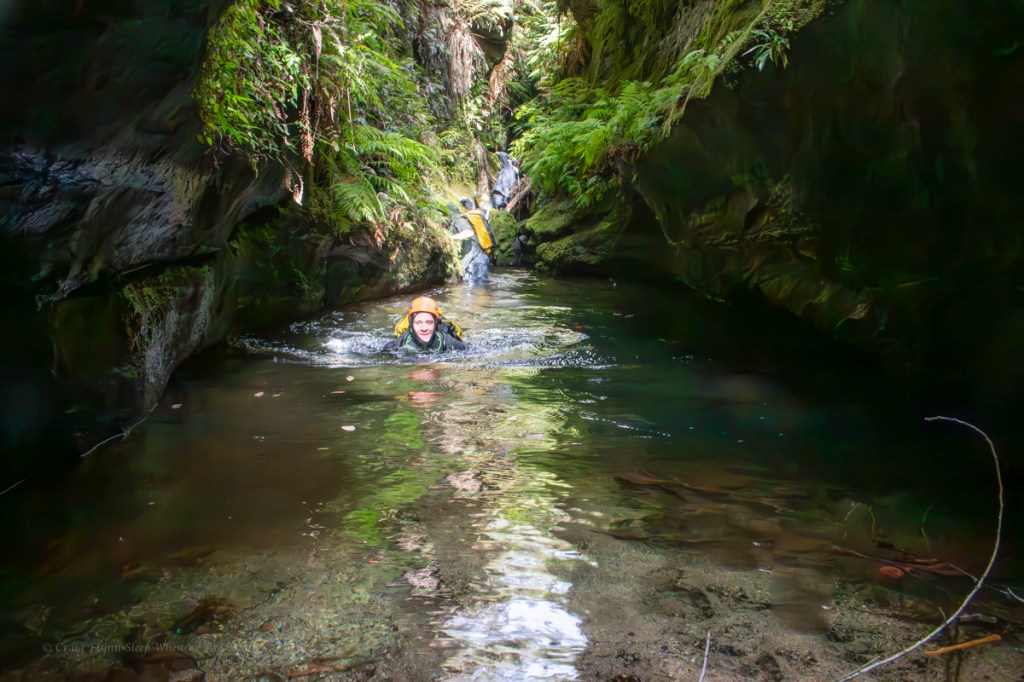 A slippery scramble down brought us to a deep, crystal clear pool. Vince spidermaned across. Russ and Jas follow.