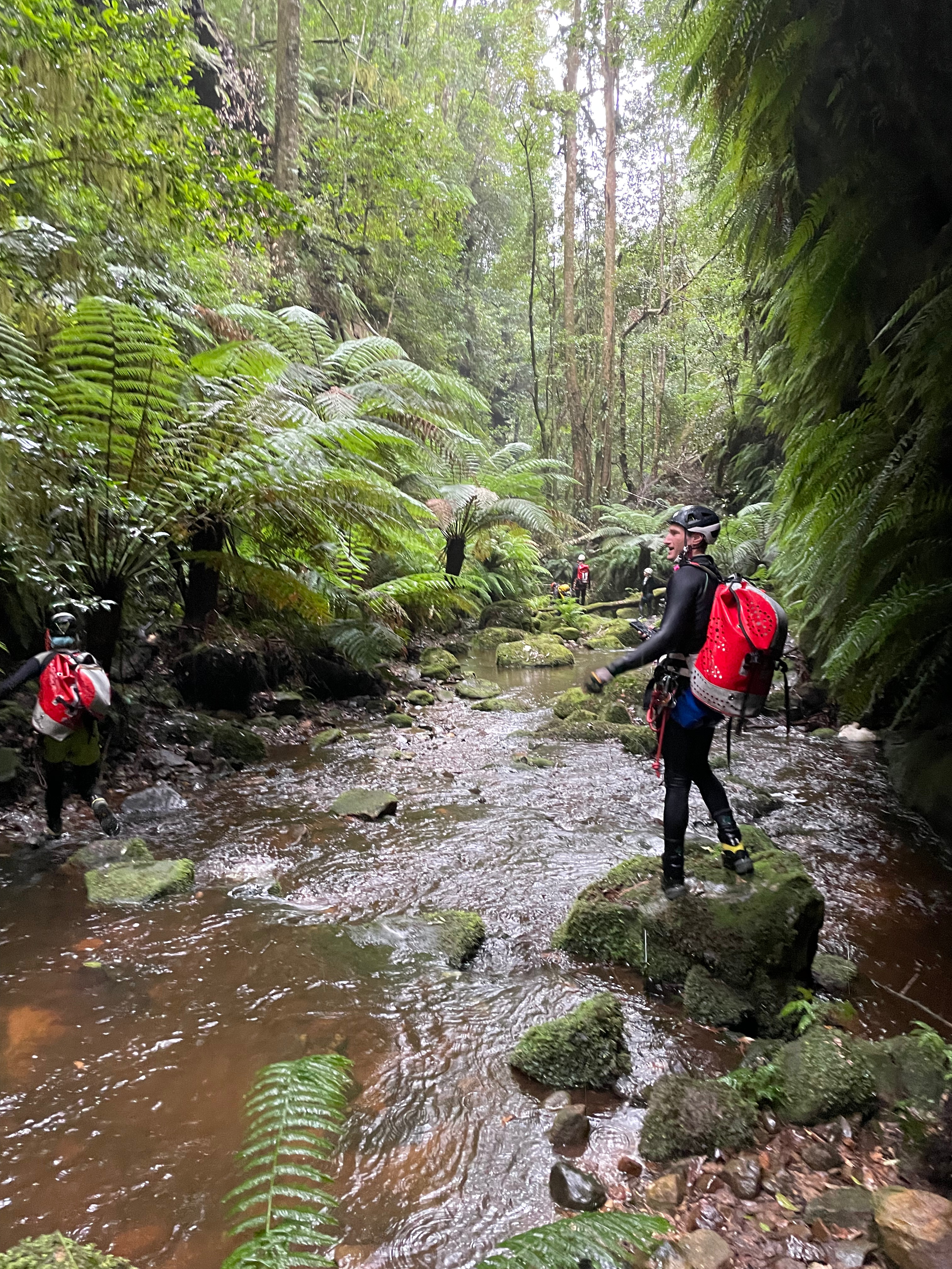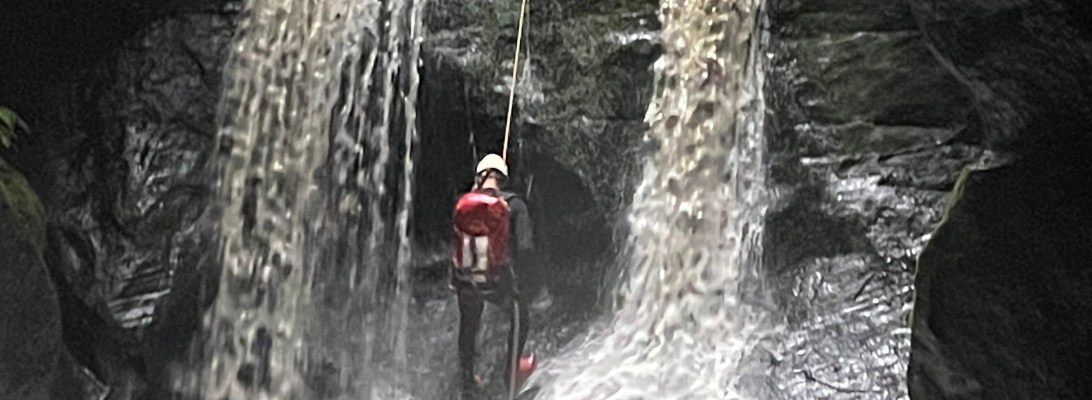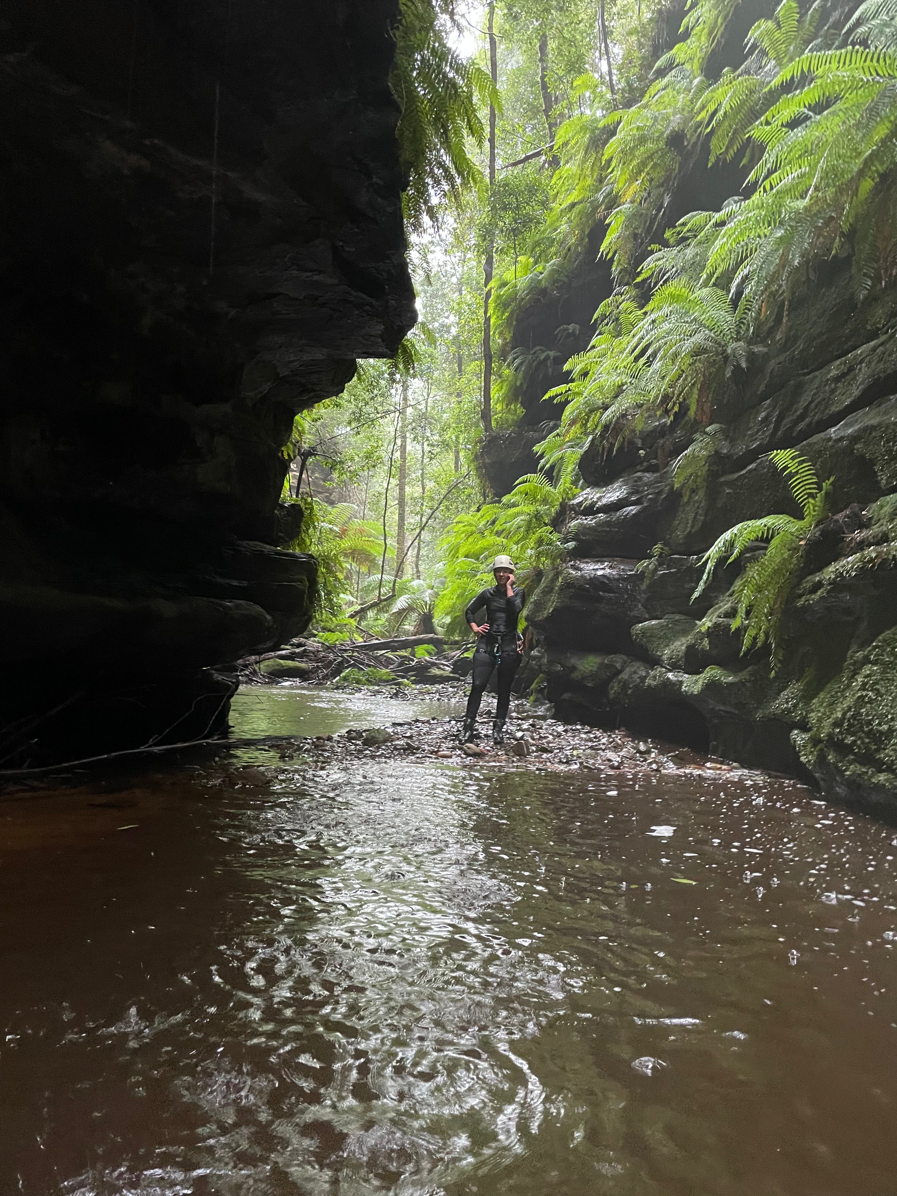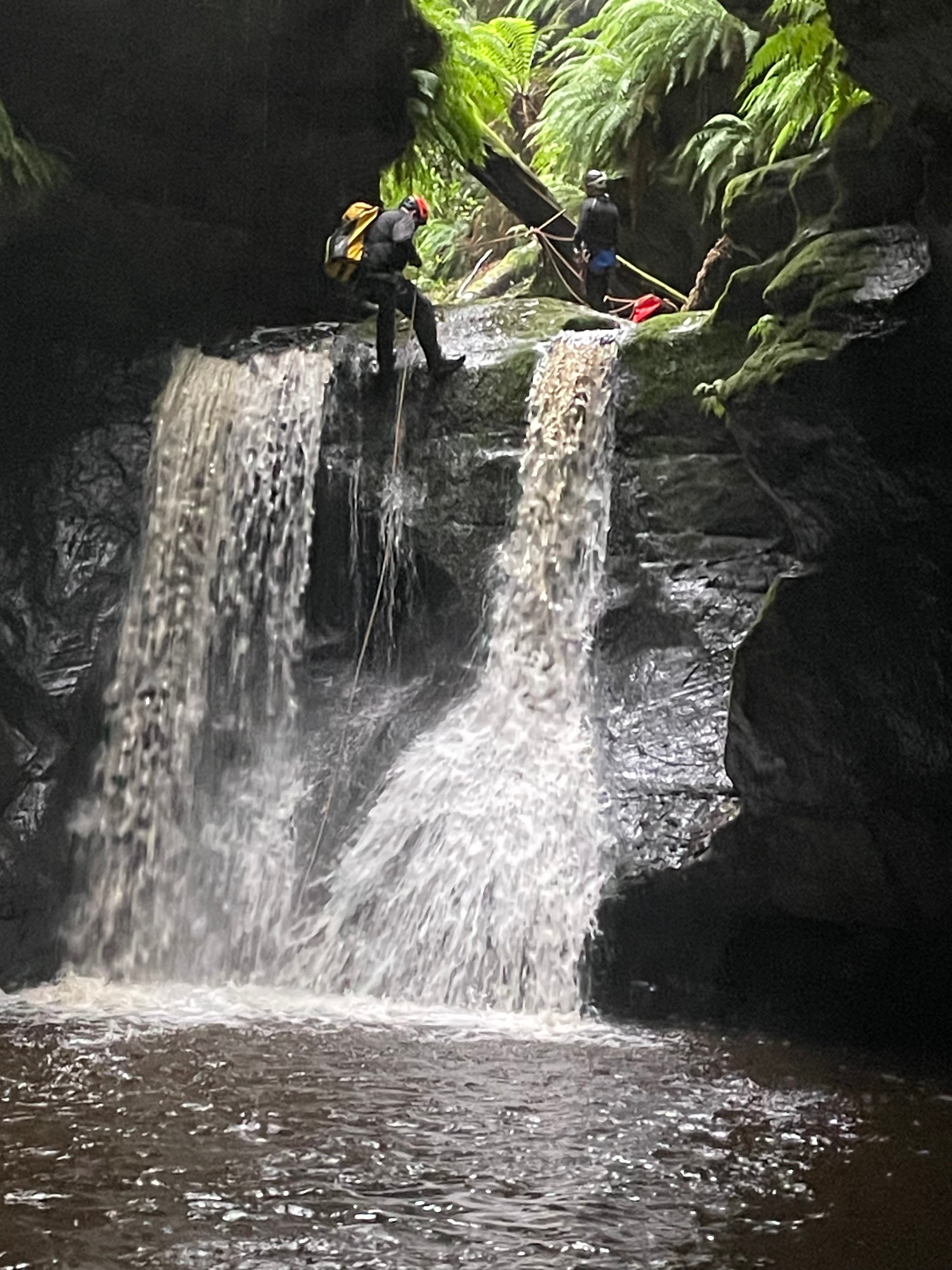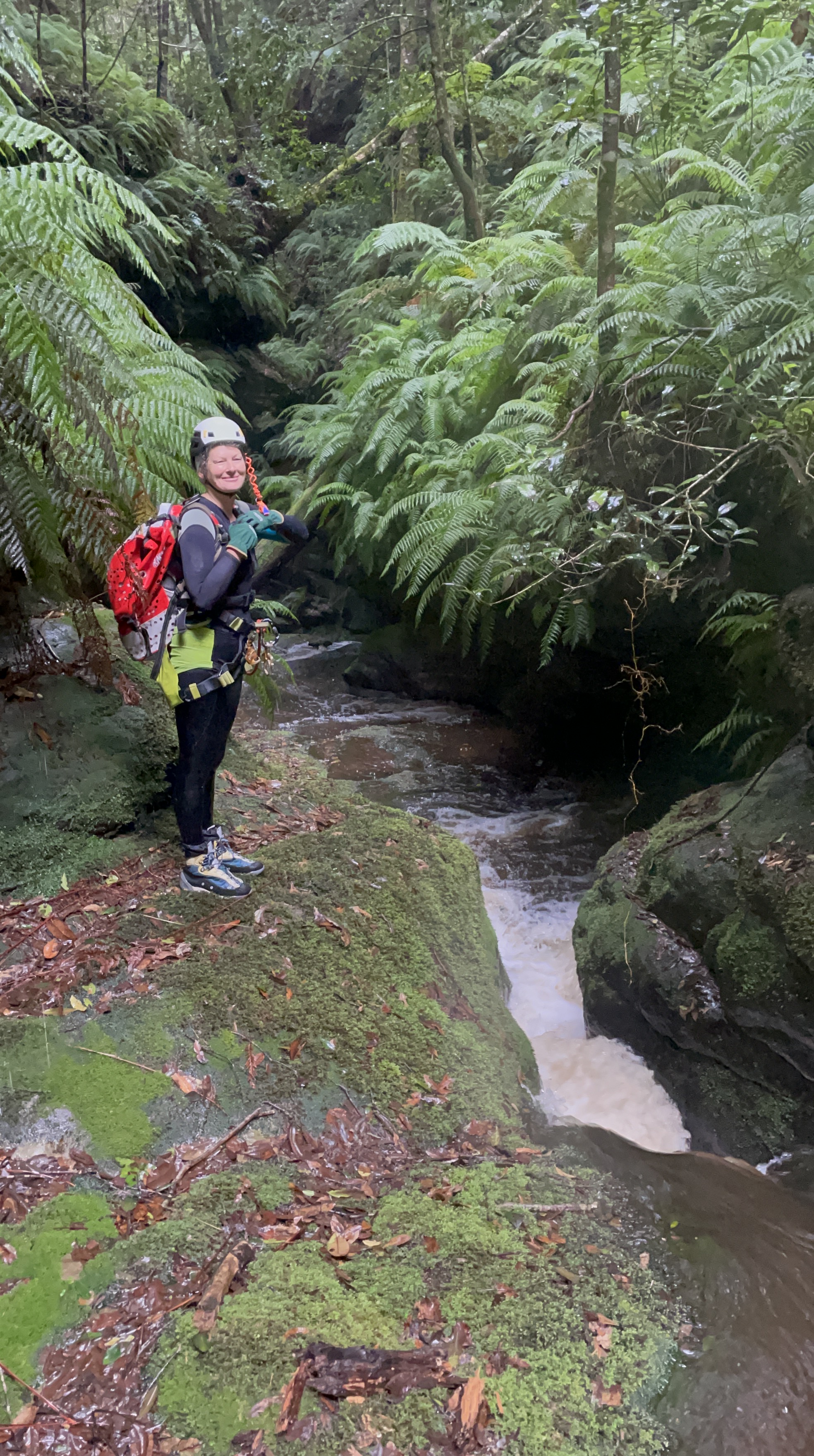 I think we gained about 200m of elevation from the road. A bit after 3pm we get to a point where we had a a reasonable view into the slot where 3 streams of the falls converge.