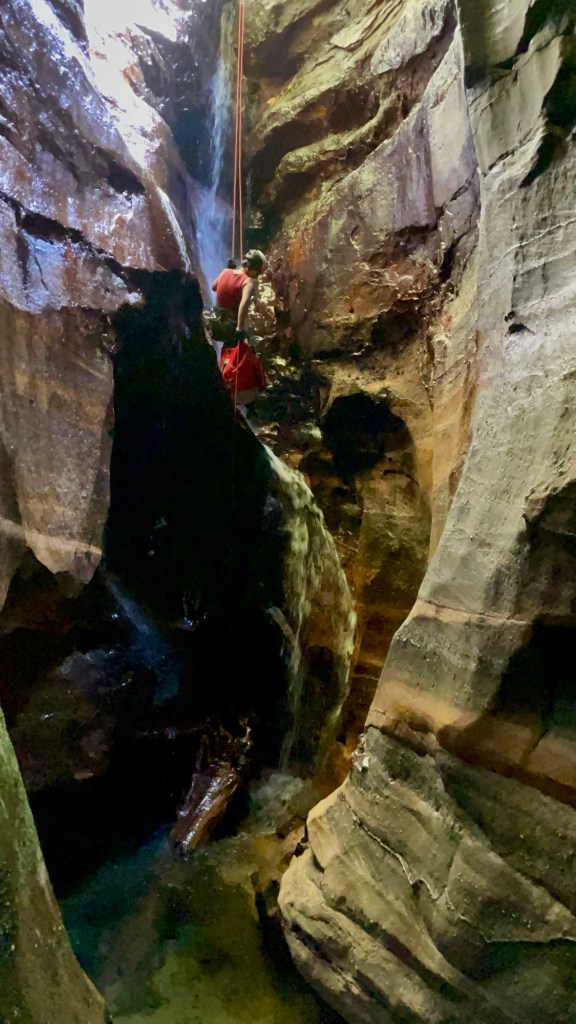 Again the canyon opens out. We believe it’s a 1km scrub bash down to the next bit so, happy with our easy day, we retrace our steps back up to the waterfall. A crowd of people are here now.