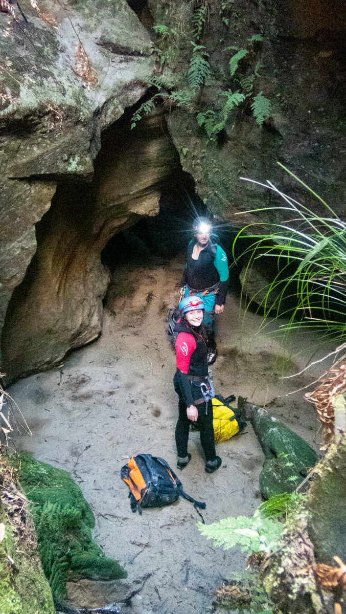 And then the longest abseil, down through a hole. When we first visited this I remember it being a sandy floor with a log spanning a hole a bit back from the edge. you had to rope up around the log and it was a very awkward to get on rope and then you swung in and down you went. At the time we joked that “Hole in the floor” would be a better name. Now the floor is bouldery and it’s obvious you are on chock stones. The hole is right at the edge, the log all but decayed. A handy anchor is found on the wall.