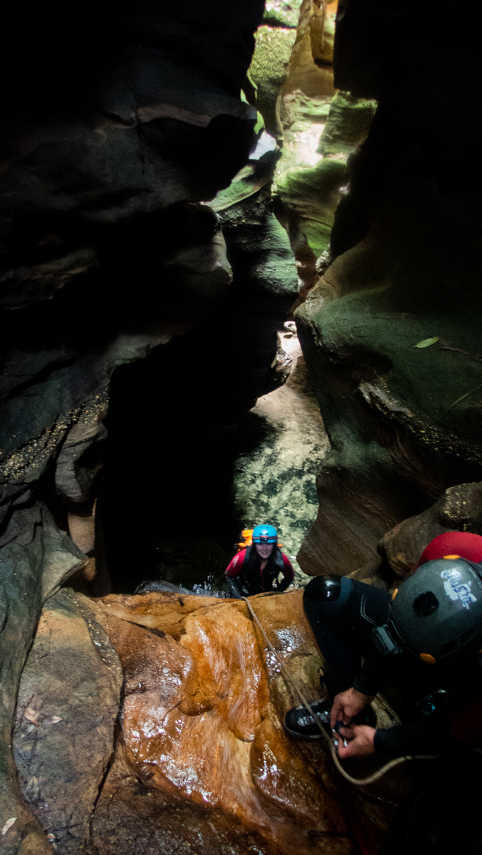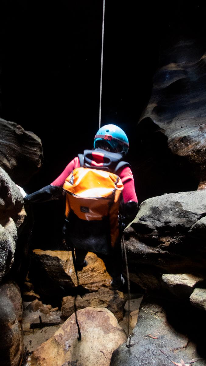 Banks is interesting. Cutting through the upper layer of Banks sandstone, the walls aren’t that deep but it is consistently narrow. There is a lot of sucking in stomachs, squeezing, dragging packs behind as there not enough room for both you and a pack. Even the go pro chest mount had to come off. The abseils in the constrictions are short but interesting. The one into the dark is technical and cool. Duck unders where you have to pass short under water tunnels to get through and one or two tricky down climbs that look like some parties rope up for… The water isn’t flowing as much here and after the crystal clear water of HITW it’s a little stagnant and pongy in places.
