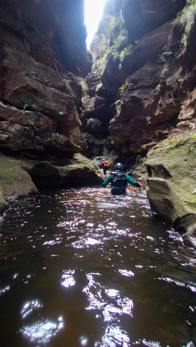 The top sections contains some scrambles and wades between deep twisting walls, but no abseils