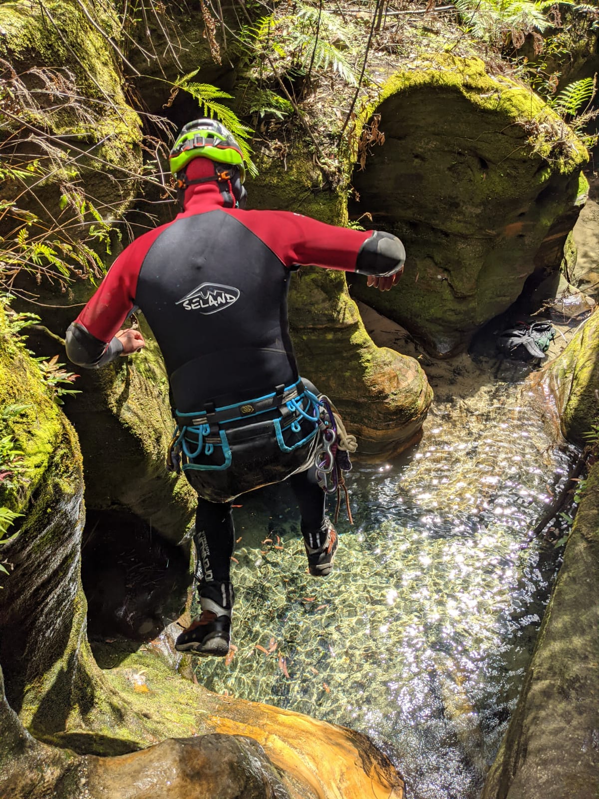 The walls close back in and we get to the first abseil. Ed declares it can be jumped. We suit up and have a quick bite too eat. The plan is for a few little stops for food rather than 1 long lunch