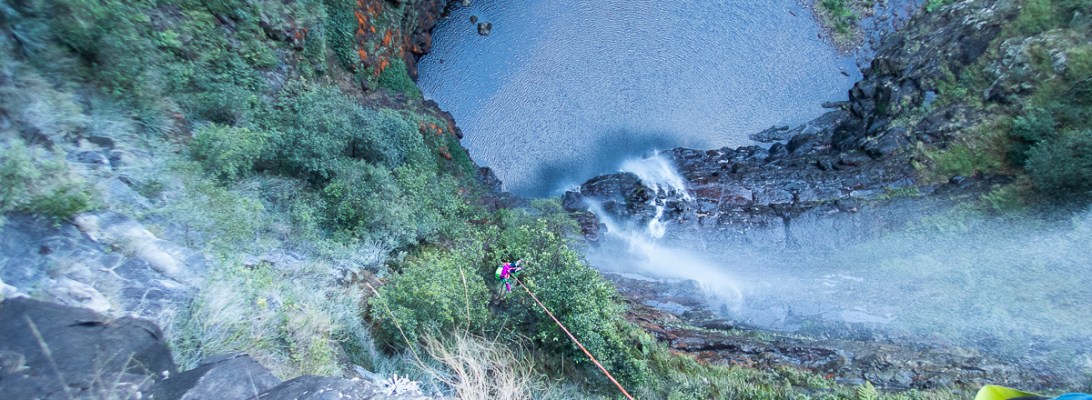 And then there’s more scrambling and boulder hopping down to the top of Margaret Falls. This is what we are here for. Abseiling beside the 110m waterfall has become a popular option lately. Previously it involved silly long ropes and/or passing knots so not many people contemplated it. New rebelay options make it more appealing but please note it’s not simple and you need to be familiar with hanging belays and advanced techniques. Just getting to the anchors is not straight forward.