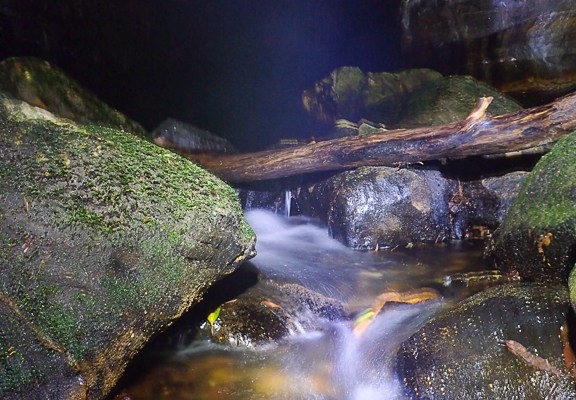 More and more Glowworms adorned the steep walls that overhang the access trail. Soon enough we reach the start of the canyon. In the still night the roar of the waterfall seemed amplified 10fold.