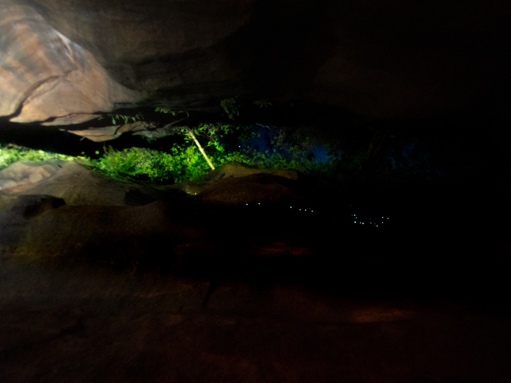 Concentrating in finding foot placements in the dark I had to remind myself to stop and look around. Not far in I spot that familiar green glow. The first of the glow worms. A few dim spots nestled into cracks in the wall